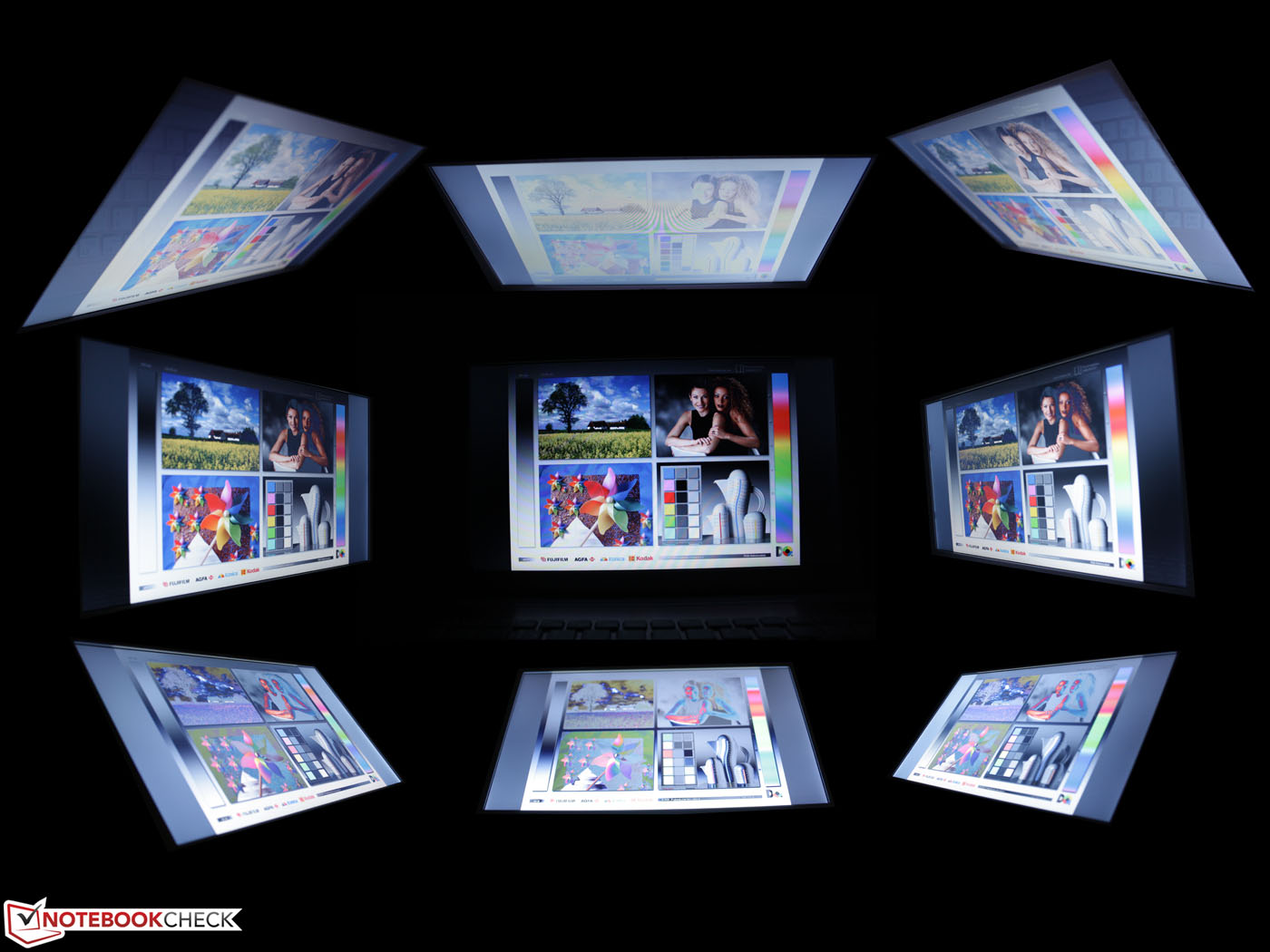 Das Dunkelkammer-Bild zeigt die knappen Blickwinkel des Vaio SVE. Diese spielen dann eine Rolle, wenn mehrere Augenpaare in die Anzeige schauen. Für ein Lifestyle-Subnotebook durchaus ein relevantes Szenario. Die horizontalen Blickwinkel sind noch akzeptabel. Bis etwa 50 Grad von der zentralen Position bleiben Farben sauber erhalten. Erst danach invertieren selbige deutlich. Weicht der Blick vertikal ab, dann sieht es schlechter aus. Schrift ist vertikal nur bis 35 Grad deutlich ablesbar, Farben verfälschen schon ab 20 Grad.
