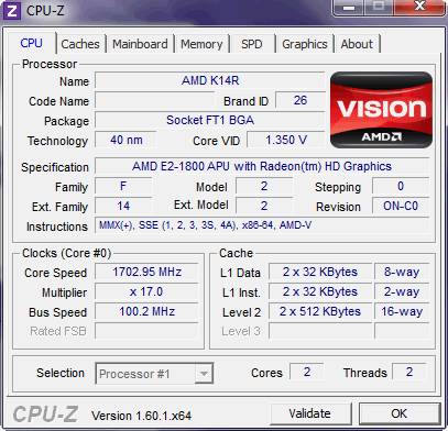 Der AMD E2-1800 beendet die Ära von E-350 und E-450, welche seit Anfang 2011 unzählige Billig-Notebooks, Subnotebooks und Netbooks bevölkerten. Der TDP liegt wie gehabt bei 18 Watt. Die Taktung liegt bei 1,7 GHz (statt 1,6 GHz beim E-450). Einen Turbo-Mode, wie bei Intel, gibt es keinen.