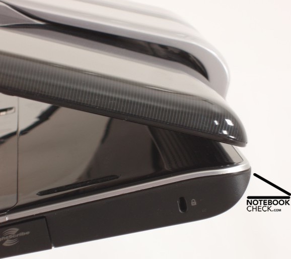 Herausragendes, wenngleich auch gewöhnungsbedürftiges Detail des HDX9130EG ist die Klapptechnik des Displays. So bringt diese eigenwillige Lösung die Option, den Bildschirm zurückzuneigen, ohne dass er sich dabei von den Augen entfernt. Der Klappvorgang selber erscheint uns jedoch etwas umständlich, zumal einerseits die Schaniere zu schwergängig sind und zu nahe beieinander liegen, was eine hohe Verwindungsanfälligkeit zur Folge hat, die der Lebensdauer sicher nicht zuträglich ist.