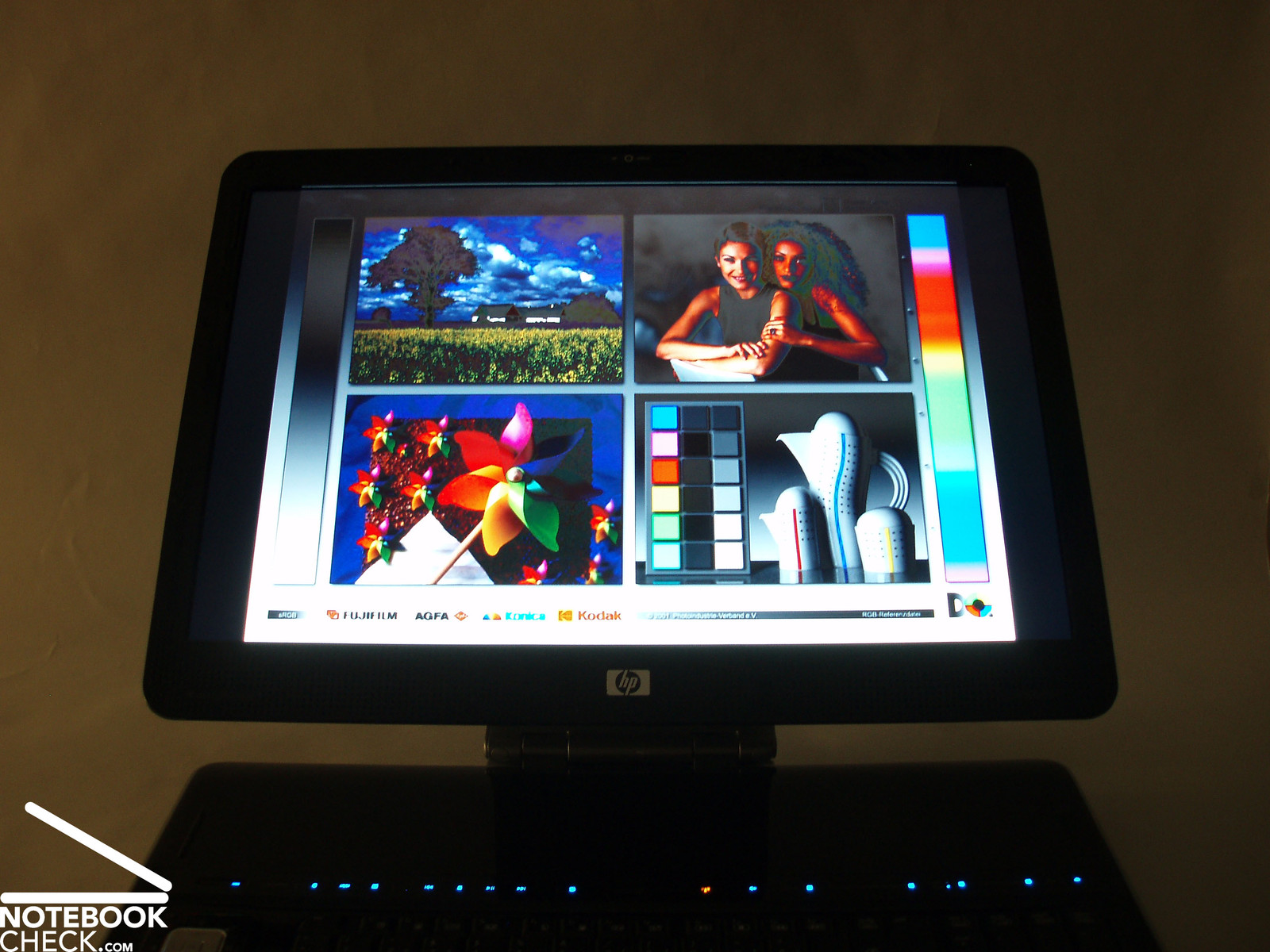 Das hochreflektierende Display mindert den Spaß bei einer eventuellen Anwenung im Freien, durch sein hohes Eigengewicht ist jedoch der Pavilion dafür ohnehin nicht sehr gut geeignet. Die Farben des WSXGA+ Displays leuchten und sind knackiger als bei vergleichbaren Modellen anderer Marken. Die Blickwinkelstabilität lässt einen großen Arbeitsbereich zu, auch die Abweichung vom idealen Blickwinkel lässt den Mitseher das Bild noch in guten Farben und ausreichend Kontrast betrachten.