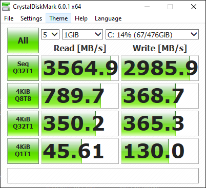 Das M90n Nano verfügt über zwei M.2-Speicherschächte, die mit SATA- und PCIe-Laufwerken kompatibel sind. Unser Testgerät ist mit einer 512 GB großen, extrem schnellen Samsung PM981 ausgestattet. Laut CrystalDiskMark 6 liegen die Lese- und Schreibgeschwindigkeiten bei ca. 3,5 bzw. 3,0 GB/s. Nutzer haben direkten Zugriff auf beide Speicherschächte und sind somit dazu in der Lage, die Laufwerke auszutauschen oder einen RAID-Verbund einzurichten.