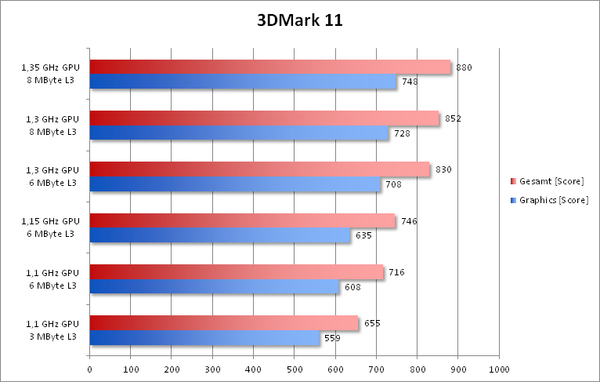 Der 3DMark 11 reagiert dagegen deutlich sensibler auf die Größe des Zwischenspeichers. Mit knapp 9 Prozent (3 zu 6 MByte) beziehungsweise 3 Prozent (6 zu 8 MByte) ist der L3-Cache kein unbedeutender Leistungsfaktor. Ebenfalls interessant: Taktsteigerungen werden bei gleicher Cachegröße nahezu linear in Mehrleistung umgewandelt. Dies deutet darauf hin, dass die Speicherbandbreite - zumindest bei DDR3-1600 im Dual-Channel-Modus - kaum limitiert.