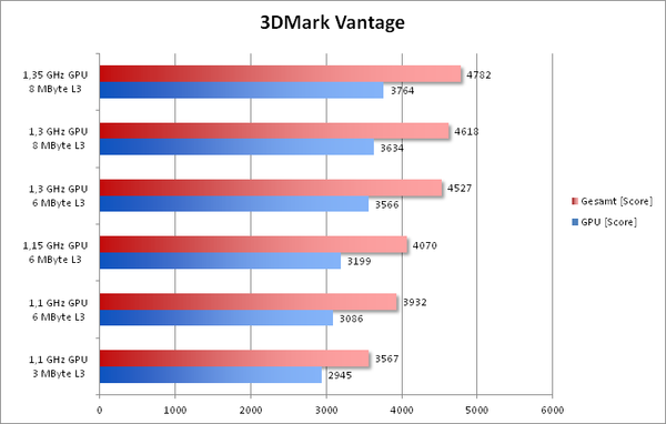 Insgesamt ähneln die Ergebnisse in etwa denen des 3DMark 11. Vor allem der Schritt von 3 auf 6 MByte L3-Cache sowie die Taktrate bestimmen die Performance.