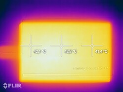 Nach rund einer halben Stunde hatte sich die T7 spürbar erwärmt, und die Flir-Wärmebildoptik bescheinigt der Samsung SSD eine Oberflächentemperatur von bis zu 42,3 °C, im Hotspot haben wir mit dem IR-Thermometer rund 43 °C gemessen. Das ist zwar schon warm, aber absolut unbedenklich.