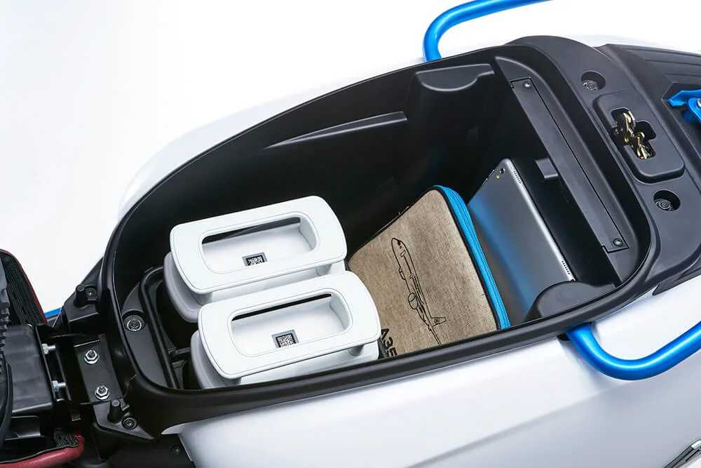 Laut den uns vorliegenden Informationen ist der 110 Kilogramm schwere Kymco Like 125 EV des Modelljahrs 2022 mit wechselbaren "Ionex"-Lithiumbatterien (LiFePo4) in Modulbauweise ausgestattet, die dem schicken Elektroroller eine Reichweite von bis zu 200 Kilometern verleihen sollen. Bis zu fünf Akkumodule inklusive der Basisbatterie, die jeweils ein Gewicht von 6 Kilogramm und eine Kapazität von 650 Wattstunden (50 V/13 Ah) haben, lassen sich im Like 125 EV unterbringen. Das Staufach des Elektroflitzers fasst 27 Liter. Dort passen bis zu drei Ionex-Akkupacks hinein. Komplett Aufladen lässt sich der smarte eRoller in rund 1 Stunde.