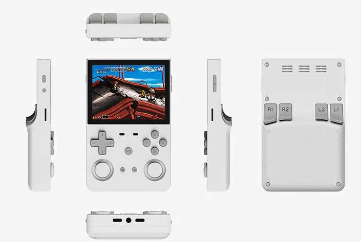 Das Modell kommt mit zwei Joysticks, Steuerkreuz und Aktionstasten und insgesamt vier Schultertasten, die Rückseite des Handhelds ist texturiert, was wahrscheinlich einen besseren Halt verspricht. Verbaut ist ein 3,5 Zoll großes IPS-Display. Wie ganz üblich ist ein Speicherkartenslot verbaut, als Betriebssystem sollen sowohl ArkOS als auch EmuELEC unterstützt werden. Ein Lautsprecher mit einer Leistung von einem Watt ist verbaut, es ist ein Akku mit einer Kapazität von 3,000 mAh vorhanden. Dieser wird über USB Typ C geladen, ein USB OTG-Anschluss ist aber noch vorhanden. Ein Klinkenanschluss steht bereit.