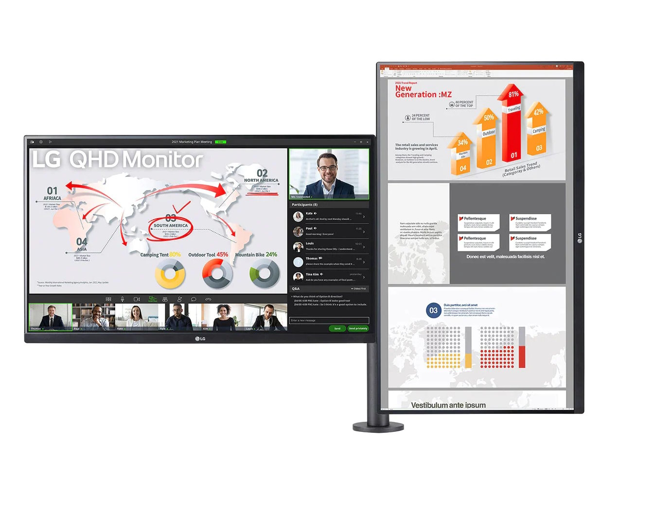 Das LG Ergo Dual 27QP88DP ist ein Monitor-System, welches auf zwei Monitoren mit einer Bildschirmdiagonalen von 27 Zoll und einer Auflösung von 2.560 x 1.440 Pixeln besteht. Dazu kommt ein spezieller Standfuß, wodurch sich die beiden einzelnen Displays besonders flexibel positionieren lassen sollen. So können die einzelnen Monitore etwa nebeneinander oder auch übereinander und im Hoch- und Querformat positioniert werden, wodurch sich auch bei unterschiedlichen Nutzungsarten jeweils eine hohe Produktivität ergeben soll.