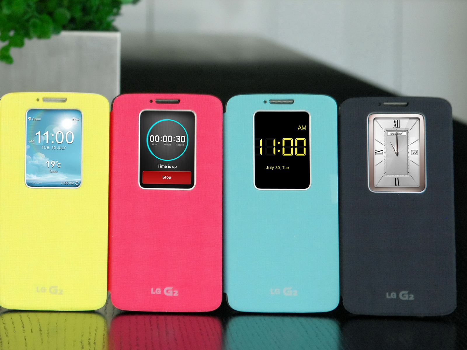 Die Smartphone-Hüllen haben ein Fenster zur Anzeige von Alarm-, Uhr- und Weckzeit, Music Player, eingehende Telefoncalls und Textnachrichten sowie dem aktuellen Wetter. LG bezeichnet das Fenster als QuickWindow. Die entsprechende Anwendung QuickWindow UX lässt sich laut LG einfach per Wischgeste auf dem Smartphone G2 aktivieren. Als weiteres Zubehör für sein High-End-Smartphone G2 wird LG auch Headsets und Portable Charger anbieten.