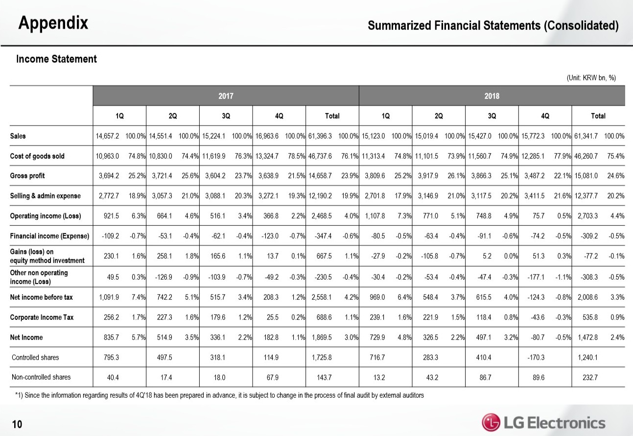 Der südkoreanischen Unterhaltungselektronikriese LG Electronics hat in seiner Bilanz die Geschäftszahlen für das Gesamtjahr 2018 verkündet. Der konsolidierte Jahresumsatz liegt mit 61,4 Billionen Koreanischen Won etwa auf Vorjahresniveau (61,3 Billionen), der Nettogewinn stieg um 2,4 Prozent von 1,47 Billionen auf 1,87 Billionen Won, umgerechnet 1,46 Milliarden Euro.