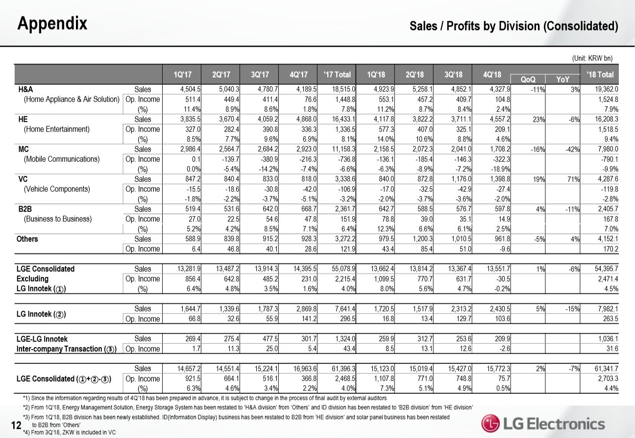 Für das 4. Quartal 2018 berichtet LG Electronics in den Geschäftszahlen einen Umsatz von 15,77 Billionen Won (12,3 Milliarden Euro). In Q4/2017 betrug der Umsatz noch 16,96 Billionen. Demnach schrumpfte der LG-Umsatz im Weihnachtsquartal des vergangenen Jahres um 7 Prozent. Und statt einem Nettogewinn von 183 Mrd. Won wie im Schlussquartal 2017, steht für Q4/2018 in der LG-Bilanz ein Nettoverlust von 81 Milliarden Won (63,4 Mio. Euro).