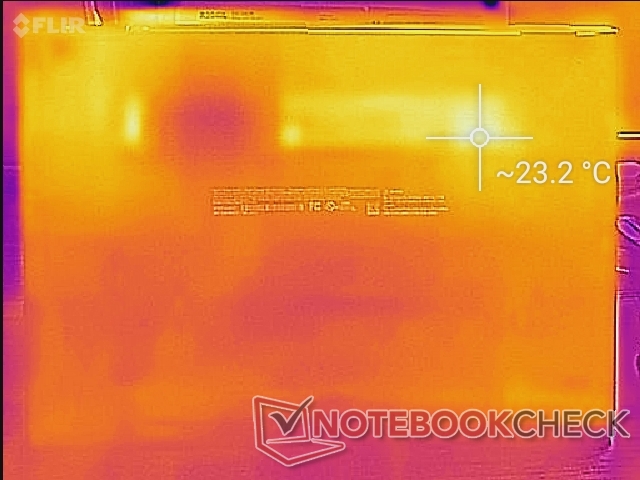 Die Oberflächentemperaturen sind kühler als beim konkurrierenden Lenovo Yoga 9 14IAP7, wenn es unter geringer Last läuft, während sie bei anspruchsvolleren Aufgaben ungefähr gleich sind. Heiße Stellen befinden sich in der Nähe der Tastaturmitte, wo die Temperatur bis zu 40 °C erreichen kann, was mit dem Gram 14T90N oder dem oben erwähnten Lenovo vergleichbar ist.