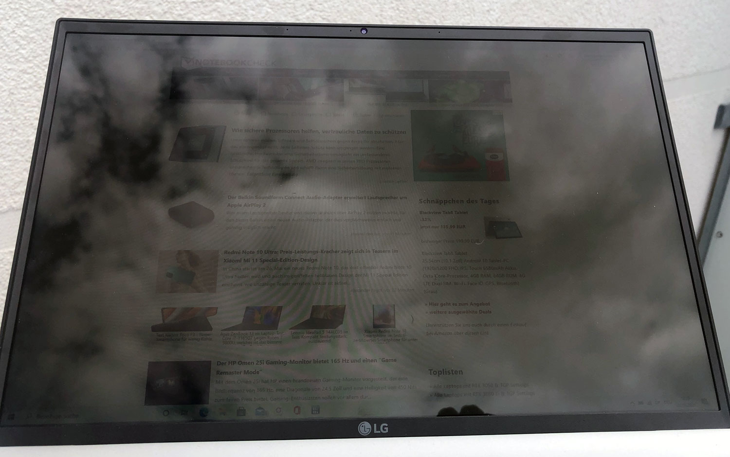 Im Außeneinsatz holt das Gerät das spiegelnde Display ein. Was drinnen bereits bei ungünstig positionierten Lichtquellen wie Fenstern stört, wird draußen zum Albtraum. Wie das unten eingebundene Foto zeigt, spiegeln sich ein bewölkter Himmel oder auch der Nutzer vor dem Gerät sehr stark. Für draußen ist das LG Gram 14Z90P also wahrlich nicht der ideale Begleiter, was aufgrund des geringen Gewichts schade ist. Vorbildlich fällt hingegen die gewohnt hohe Blickwinkelstabilität des IPS-Panels aus.