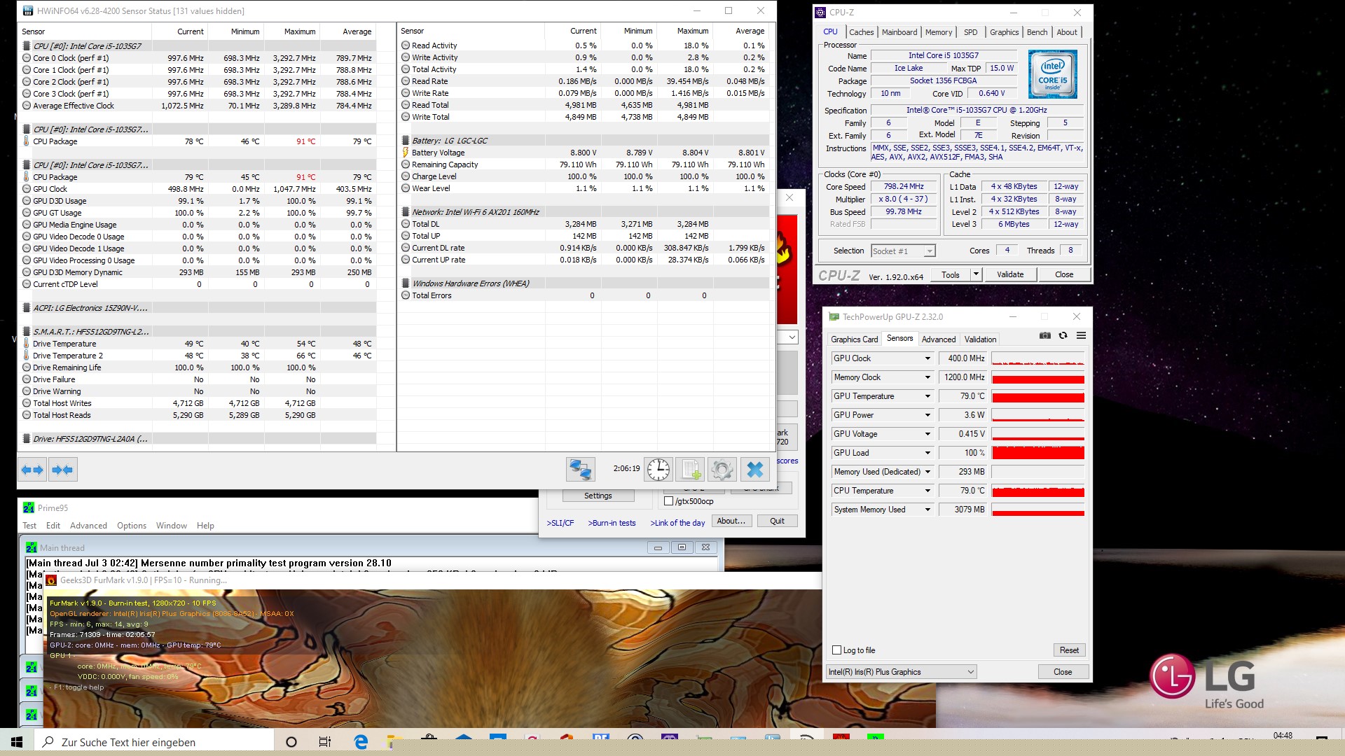 Beim einstündigen Stresstest, für den wir das Gerät mit Prime95 und FurMark parallel traktieren, erhitzte sich der Prozessor auf 91 °C. Da sich aber CPU und iGPU gemeinsam die TDP teilen, wird der CPU-Takt deutlich gedrosselt. Beim Stresstest ohne FurMark erreichten wir die gleiche Temperatur, wobei das SoC stabil mit 1,6 GHz taktete. Somit können wir ein Thermal-Throttling bei anhaltender Dauerbelastung beim LG Gram 15 ausschließen.