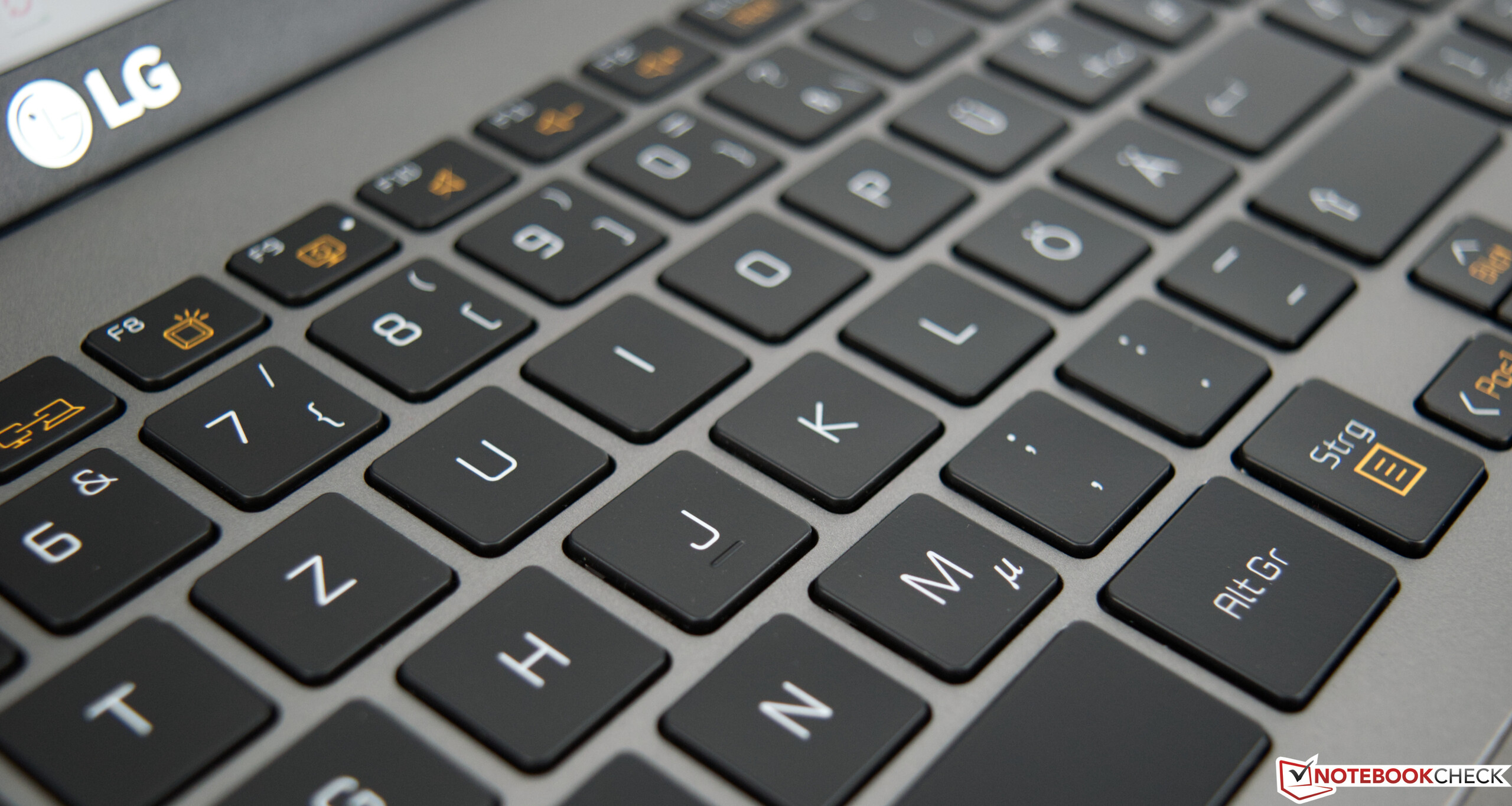 Da es das LG Gram 15 nun auch ohne Umwege in Deutschland und Österreich zu kaufen gibt, müssen die Nutzer nicht mehr mit dem QWERTY-Layout leben. Die Tasten sitzen fest an ihren Positionen und geben dem Anwender beim Tippen ein gutes Feedback. Der geringe Hub wird von einem nicht zu weichen Anschlag begleitet, der ein schwammiges Schreibgefühl verhindert. Die Tasten bieten eine gute Größe, wenngleich die Tasten des Nummernblockes bauartbedingt etwas geschrumpft sind. Eigenheiten, wie beim Vorgänger, sind weiterhin vorhanden und sorgen zu Beginn für etwas Eingewöhnung, um ein Vertippen zu vermeiden. Als Beispiel sei hier die linke Shift-Taste zu nennen, welche ohne Abstand direkt neben der [<>]-Taste platziert ist. Lobenswert ist die dezente weiße Hintergrundbeleuchtung, welche sich wahlweise in zwei Helligkeitsstufen einstellen lässt.