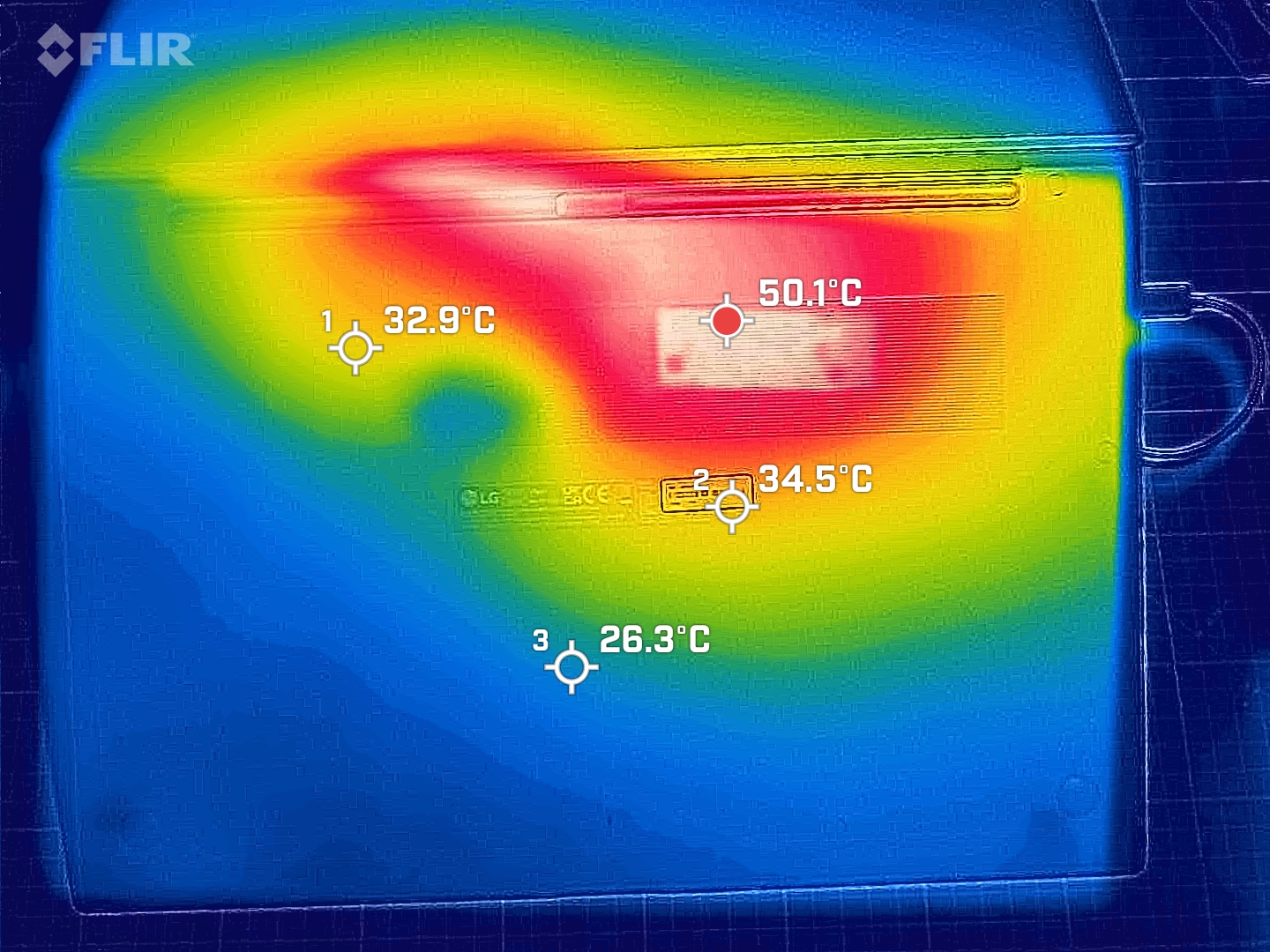 Das LG Gram 17 hat wie alle anderen Laptops von LG ein Gehäuse aus einer Magnesiumleichtmetalllegierung. Dies sorgt auch dafür, dass bereits Oberflächentemperaturen über 40 °C als unangenehm empfunden werden können. Glücklicherweise zeigt der Laptop nur in einem kleinen Bereich über der Tastatur und unter dem Kühlkörper solche Temperaturwerte. Alle Punkte, an denen man einen Laptop normalerweise berührt, bleiben hier selbst nach einer Stunde im Stresstest auf moderaten Temperaturen zwischen Raumtemperatur (22 °C) und Körpertemperatur.