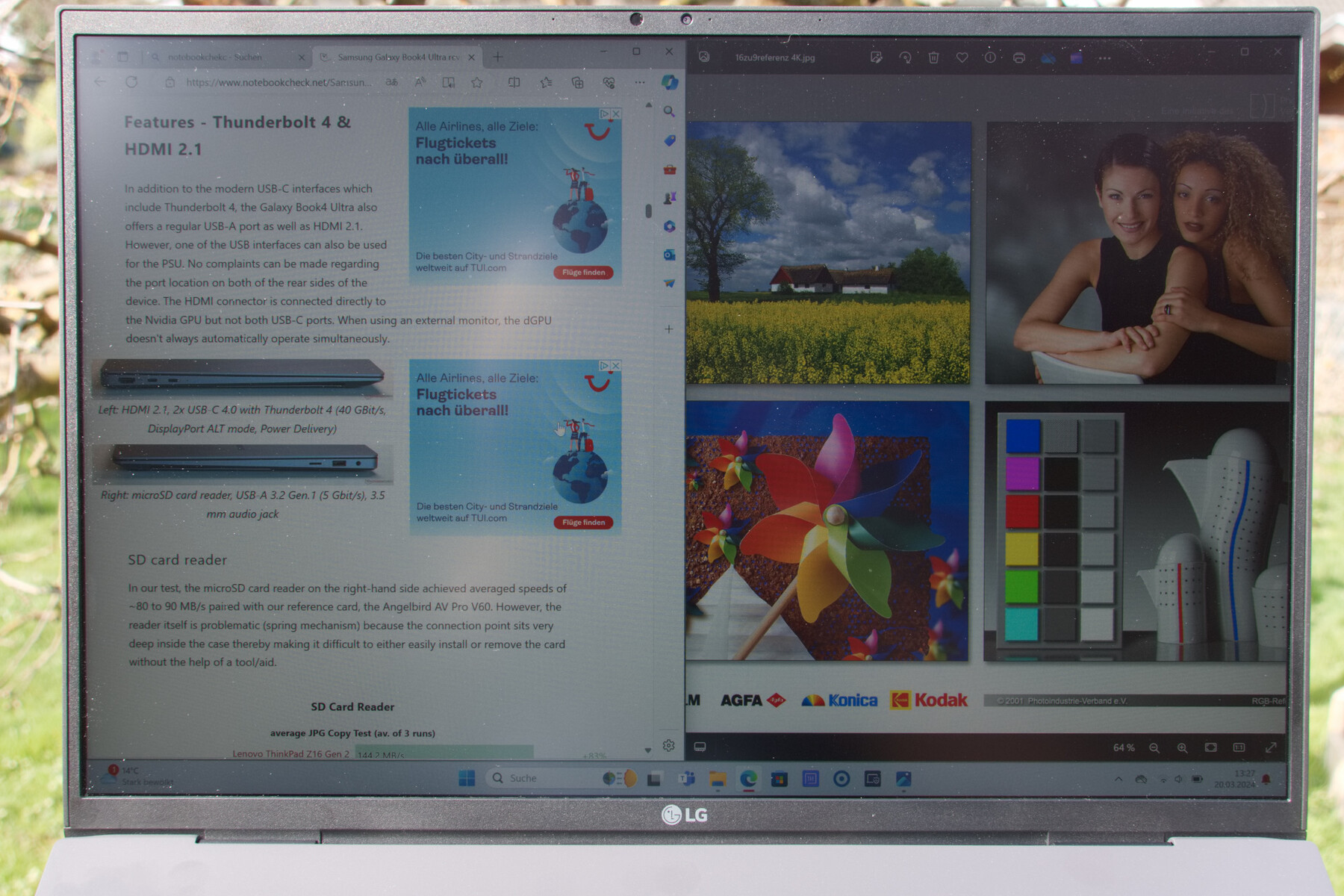 Kein anderer Hersteller bietet zum Erscheinen des Testberichts einen 17-Zöller als Büro- oder Multimedialaptop mit aktuellem Prozessor an. Wenn es beim Reisen etwa auf jedes Gramm und viel Bildschirmfläche ankommt, ist der Laptop von LG beinahe alternativlos. Wer sich hingegen mit einem 16-Zoll-Laptop zufriedengeben möchte und etwas mehr Gewicht kein Problem darstellt, findet eine wesentlich größere Auswahl an ähnlichen Laptops mit 16-Zoll-Bildschirm. Ohne Ausnahme haben Samsung Galaxy Book4 Ultra, HP Spectre x360 16 und MSI Prestige 16 eine höhere Rechenleistung. Bei der Bildqualität sehen wir oberflächlich betrachtet kaum einen Unterschied. Lediglich wenn es ein matter Bildschirm sein soll, bleibt LG unter den Konkurrenten alternativlos.