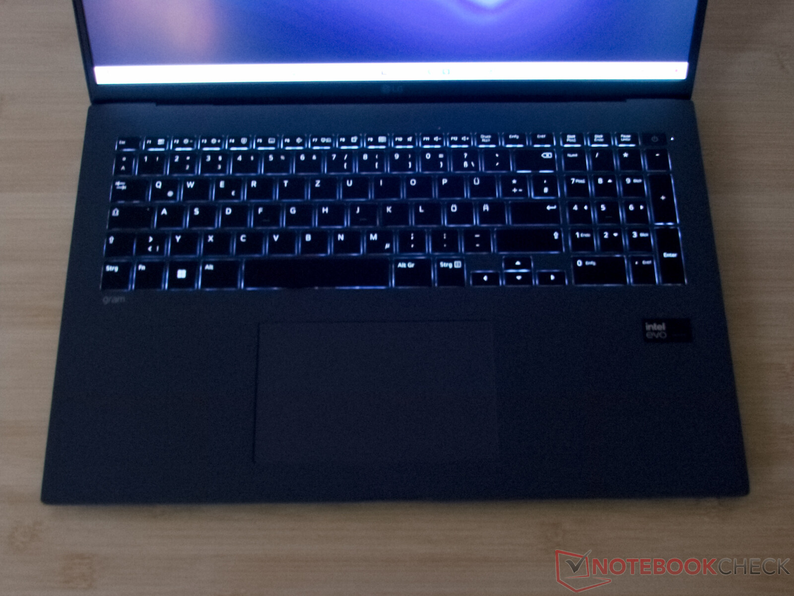 Die hintergrundbeleuchtete Tastatur des Notebooks sieht auf den ersten Blick nicht anders aus als bei den Vorgängergeräten. Aber LG hat bei der Haptik nachgebessert. Die Tastatur des neuen Gram 17 besitzt einen deutlicheren Druckpunkt. Als letzter Kritikpunkt bleibt so nur der kleine Tastenhub von etwa 0,8 mm, welcher aber angemessen ist, bedenkt man die Bauhöhe des Laptops.