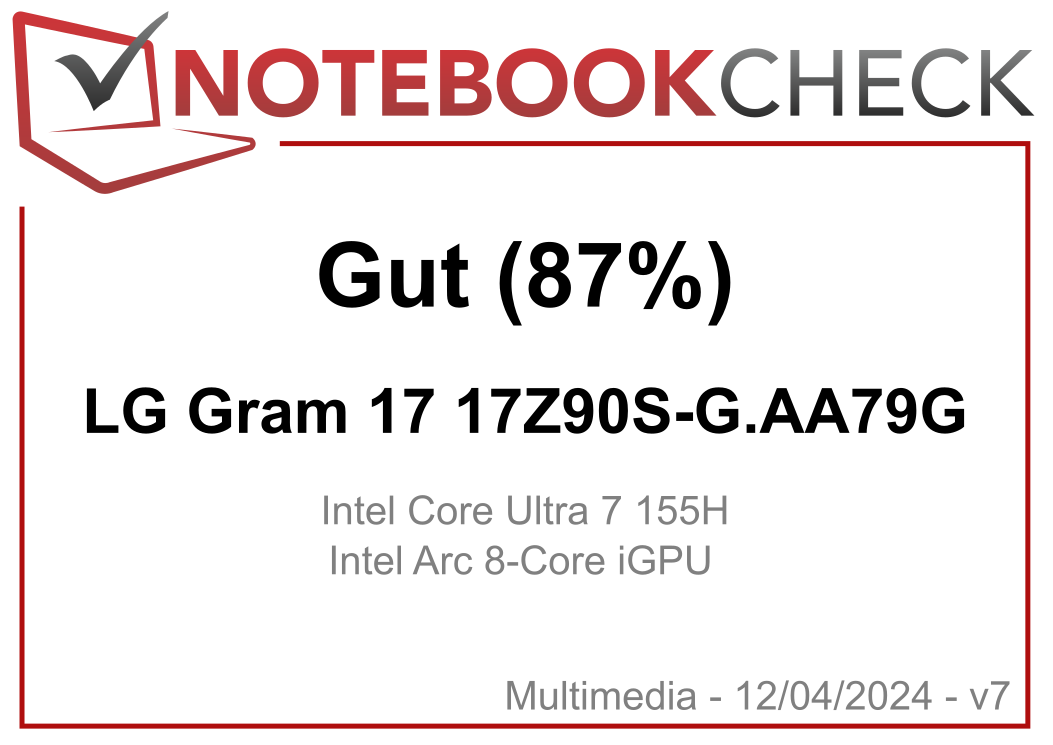 | 87 % v7 (old) | 04 / 2024 | LG Gram 17 17Z90S-G.AA79G Ultra 7 155H, Arc 8-Core | 1.3 kg | 18.1 mm | 17.00" | 2560x1600 | |