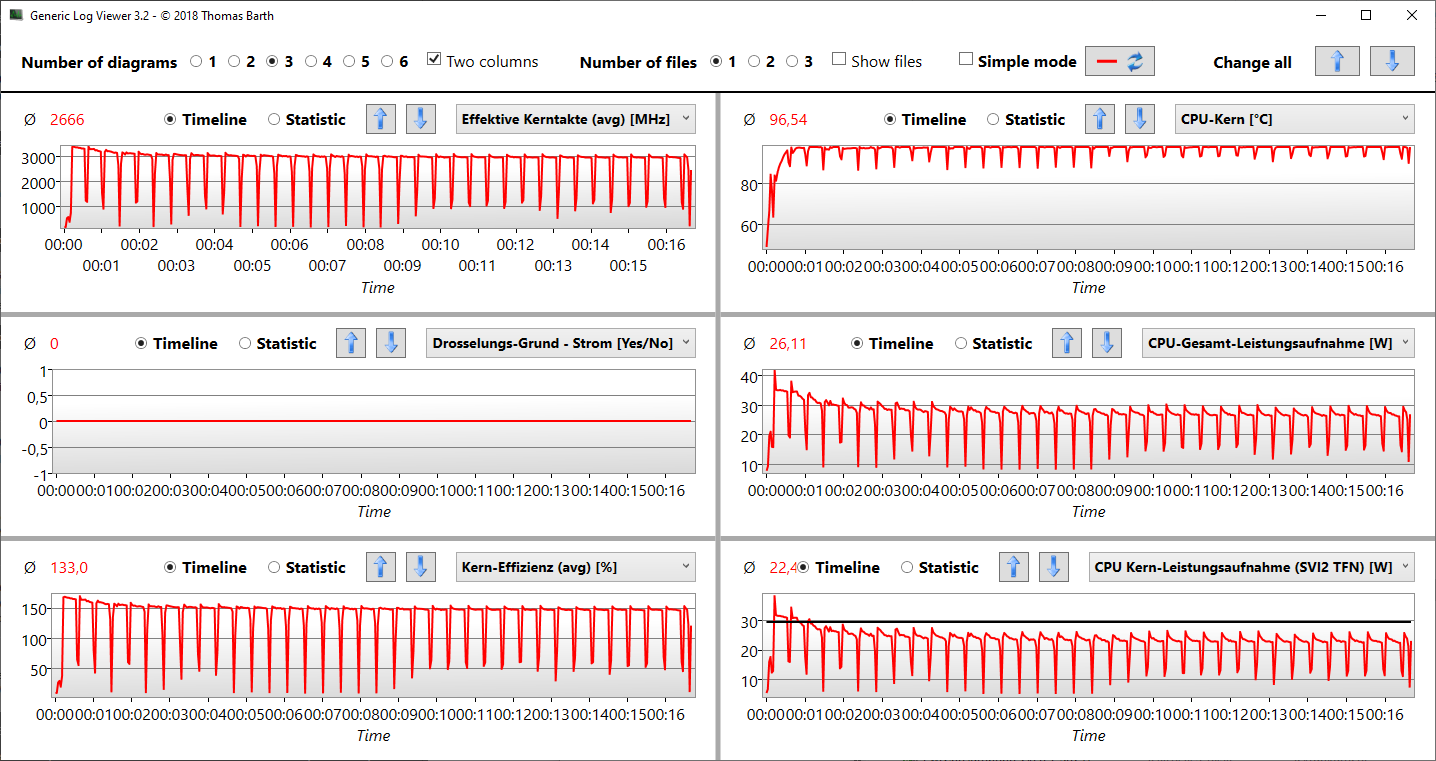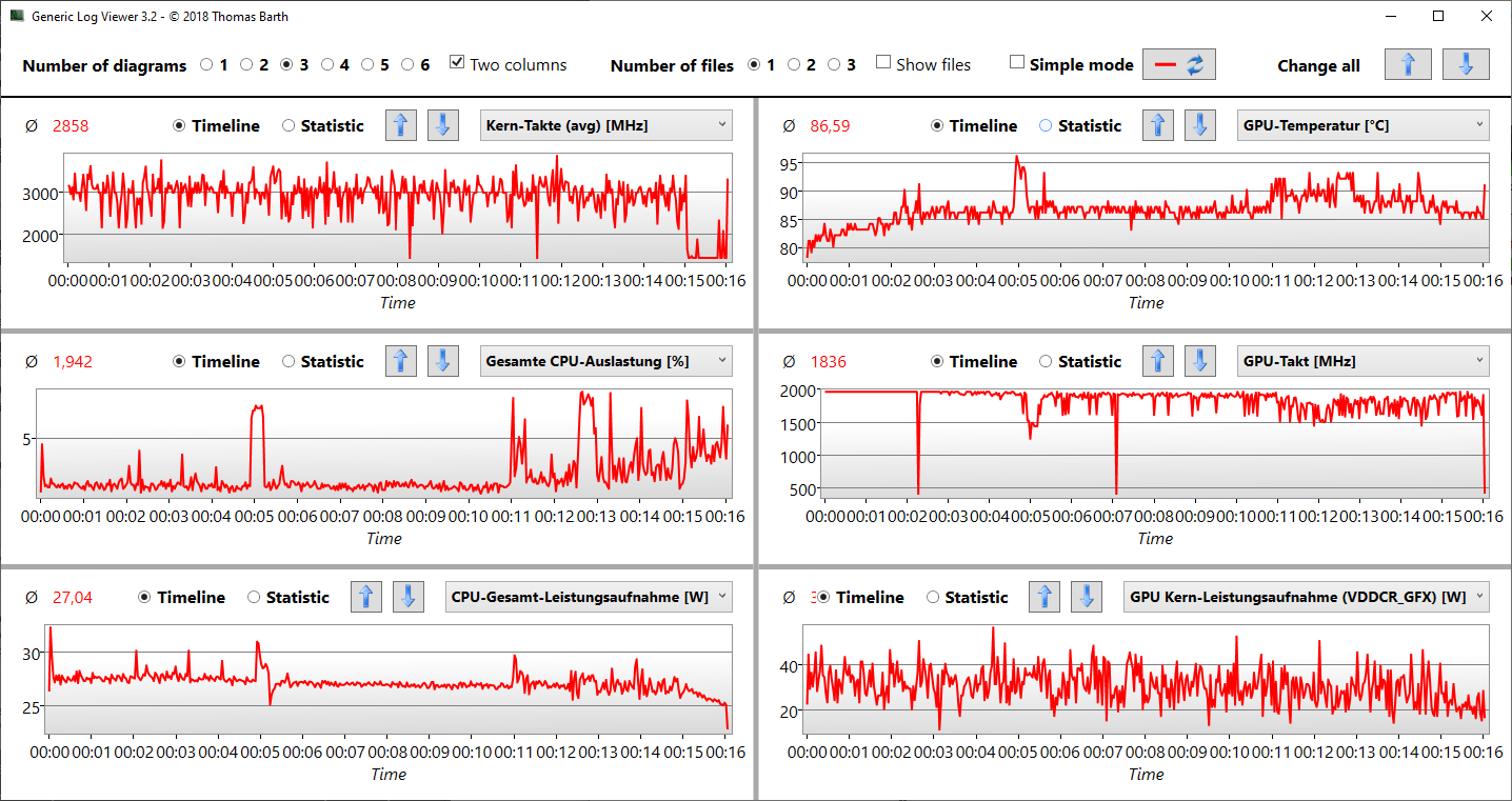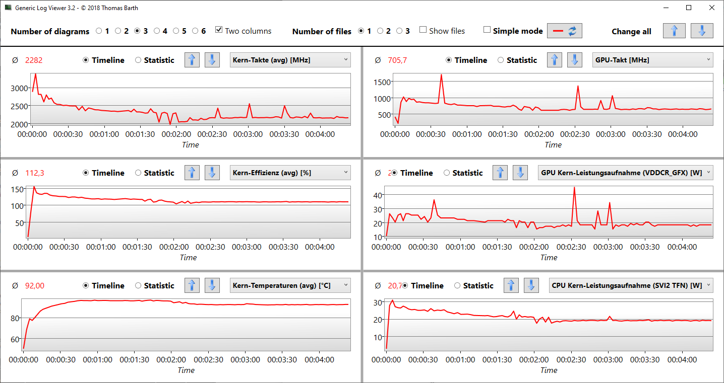 Der Stresstest zeigt einen deutlichen Rückgang des CPU- als auch des GPU-Taktes, hier ackern beide Segmente des SoC gleichzeitig, sie müssen sich den schmalen TDP teilen. Die CPU steigt mit 30 Watt ein, die iGPU mit 25 Watt. Im Verlauf gehen diese Zahlen auf 20 bzw. 18 Watt zurück, damit die Kerntemperatur bei um die 90 Grad bleibt.