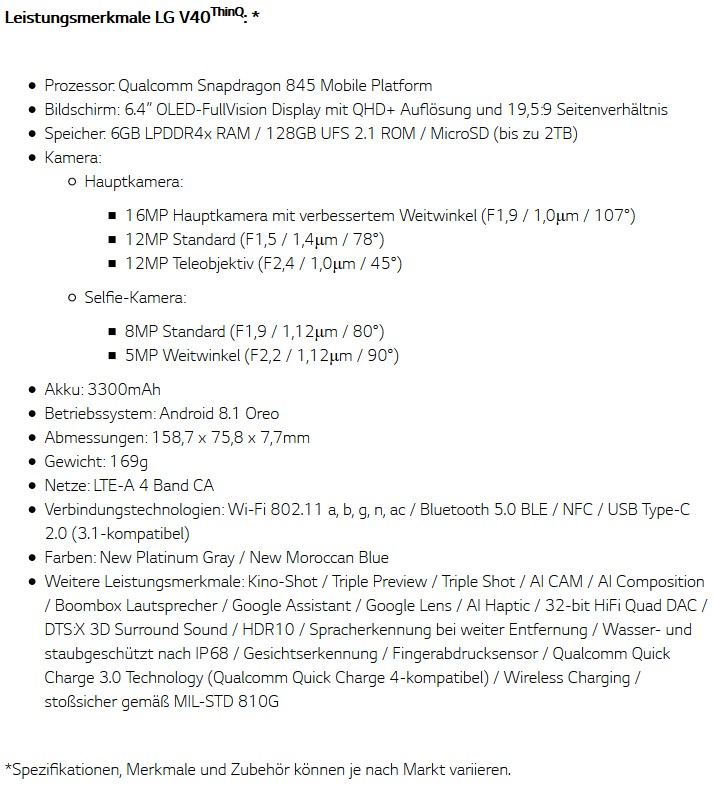 Wie LG Deutschland heute bekannt gab, wird das LG V40 ThinQ hierzulande in den Farben New Platinum Gray und New Moroccan Blue ab Ende Januar 2019 erhältlich sein. Den genauen Marktstart und den UVP für das LG V40 ThinQ will LG dann zeitnah im neuen Jahr bekannt gegeben.