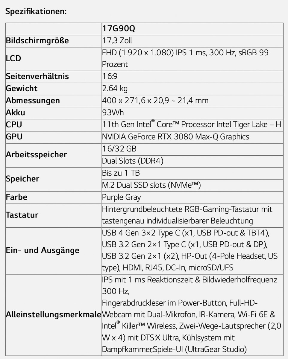 In Verbindung mit der Nvidia GeForce RTX 3080 Max-Q verspricht der Laptop dennoch eine erstklassige Gaming-Performance, Details zur TGP liefert LG nicht, die Max-Q-Bezeichnung deutet aber darauf hin, dass eher eine sparsame und dementsprechend weniger leistungsstarke Variante der GPU zum Einsatz kommt. Dazu gibts bis zu 32 GB DDR4-Arbeitsspeicher und zwei M.2-Slots für SSDs. Eines der Highlights der Ausstattung ist das 17,3 Zoll große IPS-Panel, das mit einer Bildfrequenz von 300 Hz eine Reaktionszeit von einer Millisekunde erreichen soll, der sRGB-Farbraum kann zu 99 Prozent dargestellt werden.