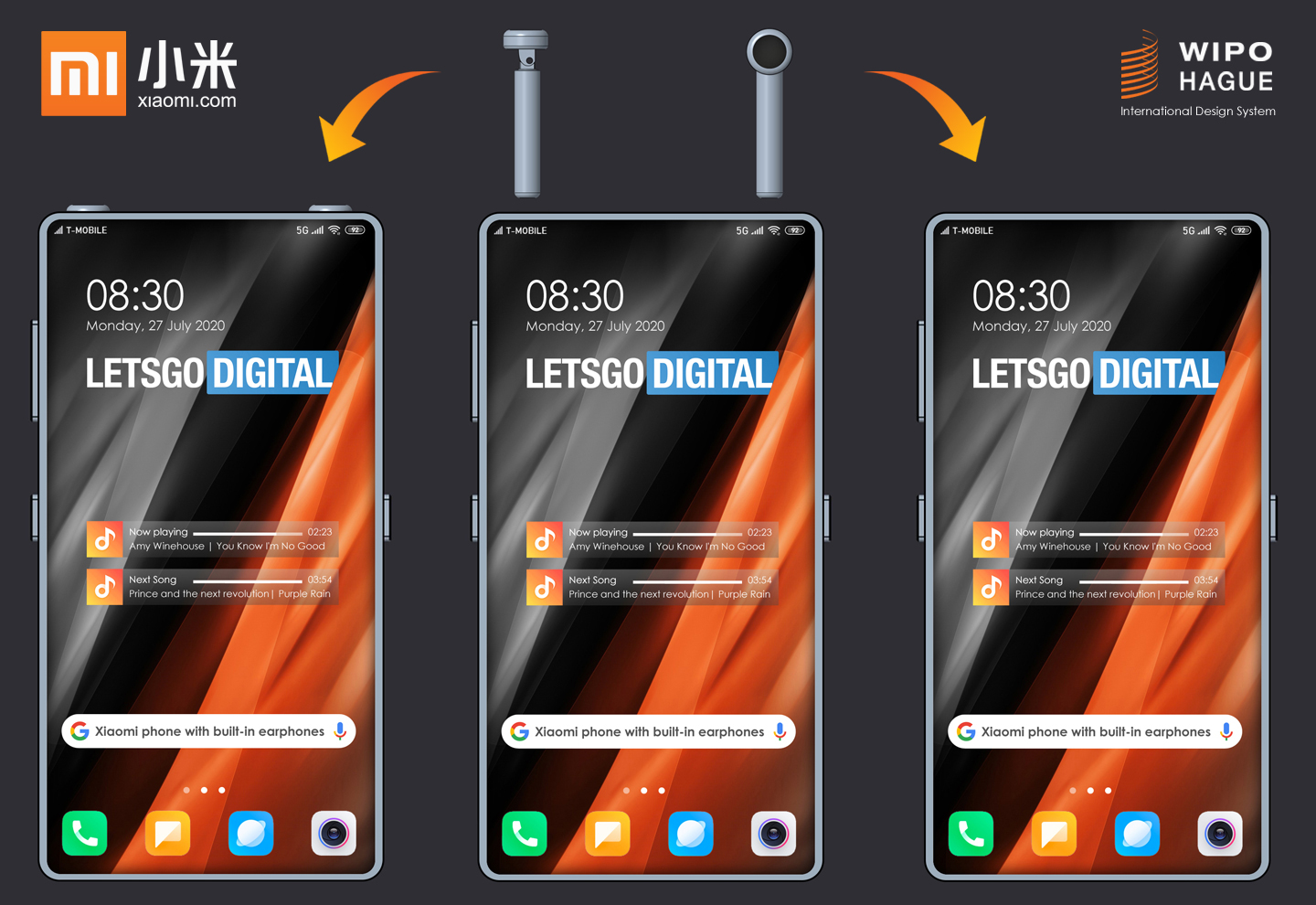 Beim nun von LetGoDigital bei der WIPO entdeckten Design-Patent, de facto handelt es sich um zwei separate Patente - siehe Quellen unten, hatte Xiaomi nun eine weitere, anfangs vielleicht verrückt wirkende, aber eigentlich durchaus geniale Idee. Ähnlich wie Samsung bei der Galaxy Note-Serie - etwa den am 5. August startenden Galaxy Note20- und Galaxy Note20 Ultra-Phones - verschwindet hier ein Zubehörteil direkt im Smartphone. In diesem Fall allerdings nicht der S-Pen sondern zwei Mi True Wireless-ähnliche Bluetooth-Ohrhörer im Stil der Apple AirPods, etwa ungewöhnlich mit abwinkelbaren Lautsprechern an der Oberseite.