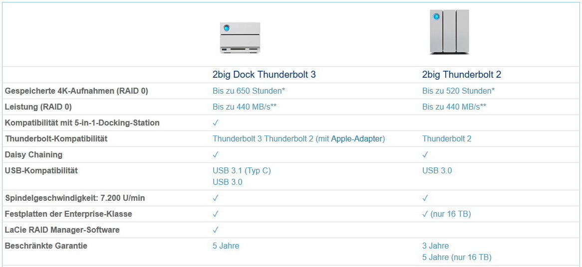 Seagate bietet mit seinem Premium-Label LaCie auch professionelle Storage-Lösungen an, die speziell auf die Bedürfnisse von Kreativen und Schaffenden in den Bereichen Foto, Film und Video zugeschnitten sind. Ab Oktober 2017 sind die Storage-Lösungen über die LaCie-Partner Mobilcom/Gravis, VideoData, Calumet, Comspot und Teltec mit den Kapazitäten 8 TB, 12 TB, 16 TB und 20 TB verfügbar. Der Einstiegspreis für die LaCie 2big Dock Thunderbolt 3 liegt bei rund 690 Euro für das 8-TB-Modell.