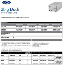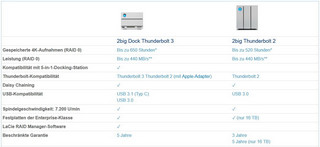 Laut den Angaben von LaCie stehen als Schnittstellen konkret 2x Thunderbolt 3, 1x USB 3.1, 1x DisplayPort, 1x USB 3.0 (Typ A) sowie die genannten Speicherkartenslots zur Verfügung. Als Datenträger kommen in den LaCie 2big Dock Thunderbolt 3 Docks die Seagate IronWolf Pro Festplatten der Enterprise-Klasse zum Einsatz.