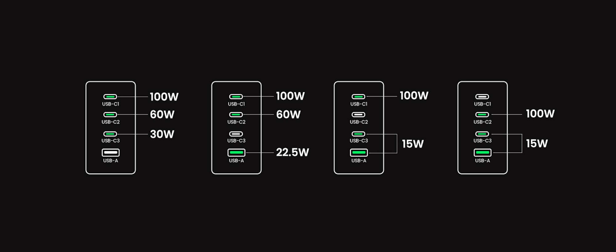 Werden alle vier Anschlüsse gleichzeitig belastet, kann am primären USB Typ C-Ausgang nach wie vor ein Notebook mit 100 Watt aufgeladen werden. Der zweite und dritte USB Typ C-Port unterstützen dann eine Ausgangsleistung von 60 und 15 Watt und über den USB Typ A-Port lassen sich dann 15 Watt ausgeben. Das 76 × 76 × 36 Millimeter große Ladegerät kann über USB Typ C bis zu 22,5 Watt abgeben, wenn höchstens drei Ports genutzt werden.