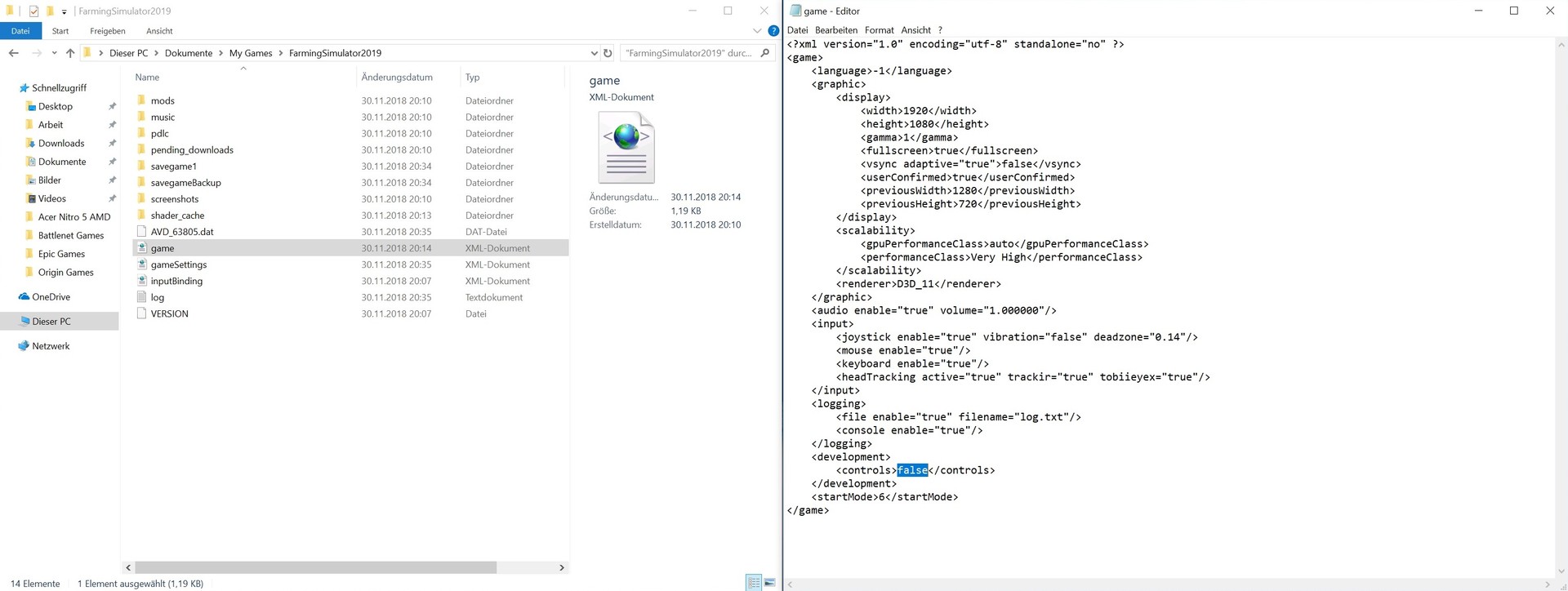 Um das eingebaute FPS-Lock von 60 Bildern pro Sekunde zu umgehen, ist ein kleiner Trick oder besser gesagt eine Anpassung der Spieldateien nötig. Wer die Performance seines Systems ausreizen möchte, muss – wie nachfolgend abgebildet – in den Dokumente-Ordner von Windows gehen und die game.xml per Editor öffnen. Weiter unten im Text gibt es die Zeile <development>, welche von <controls>false</controls> auf <controls>true</controls> geändert werden muss. Danch lässt sich im Spiel mit der Taste F3 die FPS-Begrenzung deaktivieren. Achtung: Sobald man die Settings wechselt, wird ein erneuter Druck auf F3 fällig.