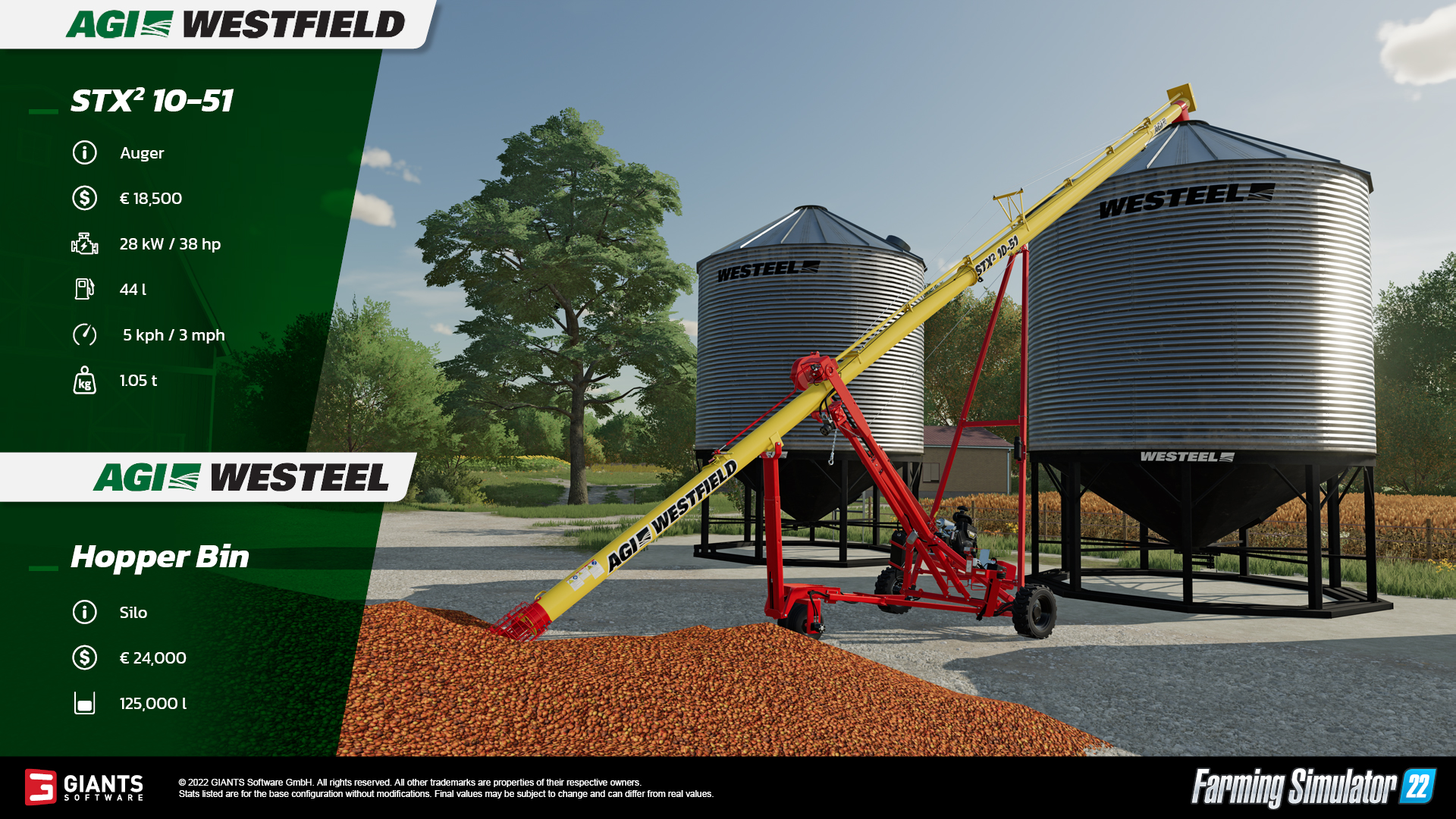 Dazu gibt es Saatwerkzeuge von AGI-Marken wie Batco oder Westfield zur effizienten Getreideverarbeitung sowie Getreidesilos und Lager der Produktlinien Sentinel und Westeel zur sicheren Aufbewahrung des Saatguts. Mit dem DLC versorgt Giants Software die LS22-Fangemeinde auch mit Patch 1.5, der zahlreiche Änderungen und Verbesserungen wie eine Schaltfläche für "Tourabbruch" und die Menüoption "Tourschritte" hinzugefügt und Fehler behebt. Zuletzt gab es für LS22-Fans das Kubota-Pack.