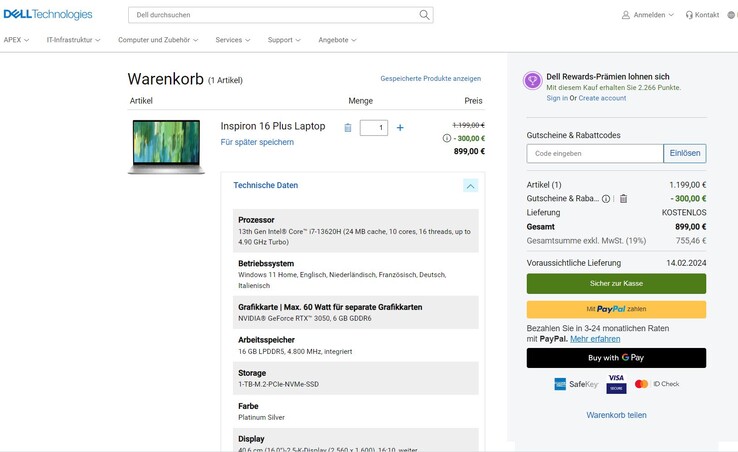 Im Online-Shop von Dell gibts derzeit das günstige Multimedia-Notebook Inspiron 16 Plus mit RTX-Grafik und QHD-Display zum Bestpreis. In Zusammenarbeit mit MyDealz ergibt sich ein Deal-Preis von 899 Euro, auf den man kommt, indem man beim Checkout den Rabattcode "MDINSPI300" eingibt. Dieser funktioniert nur mit der verlinkten Konfiguration.