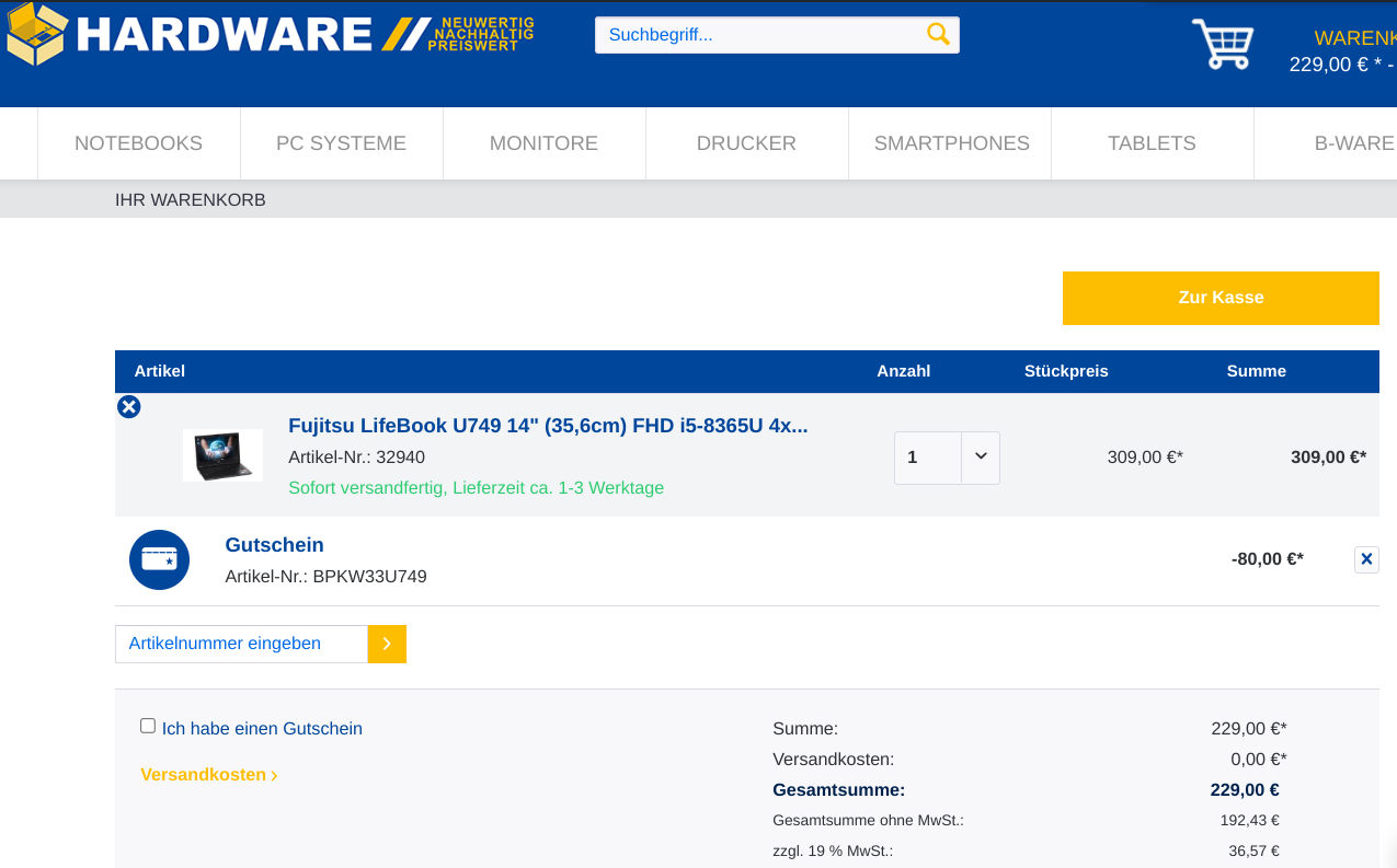 Für günstige 229 Euro gibts jetzt das Fujitsu LifeBook U749 Business-Notebook mit erweiterbaren 16 GB RAM, 256 GB SSD, Wechsel-Akku, LTE und Windows 11 Pro im Angebot. Um auf den Deal-Preis zu kommen, gibt man den Rabattcode "BPKW33U749" im Warenkorb an.