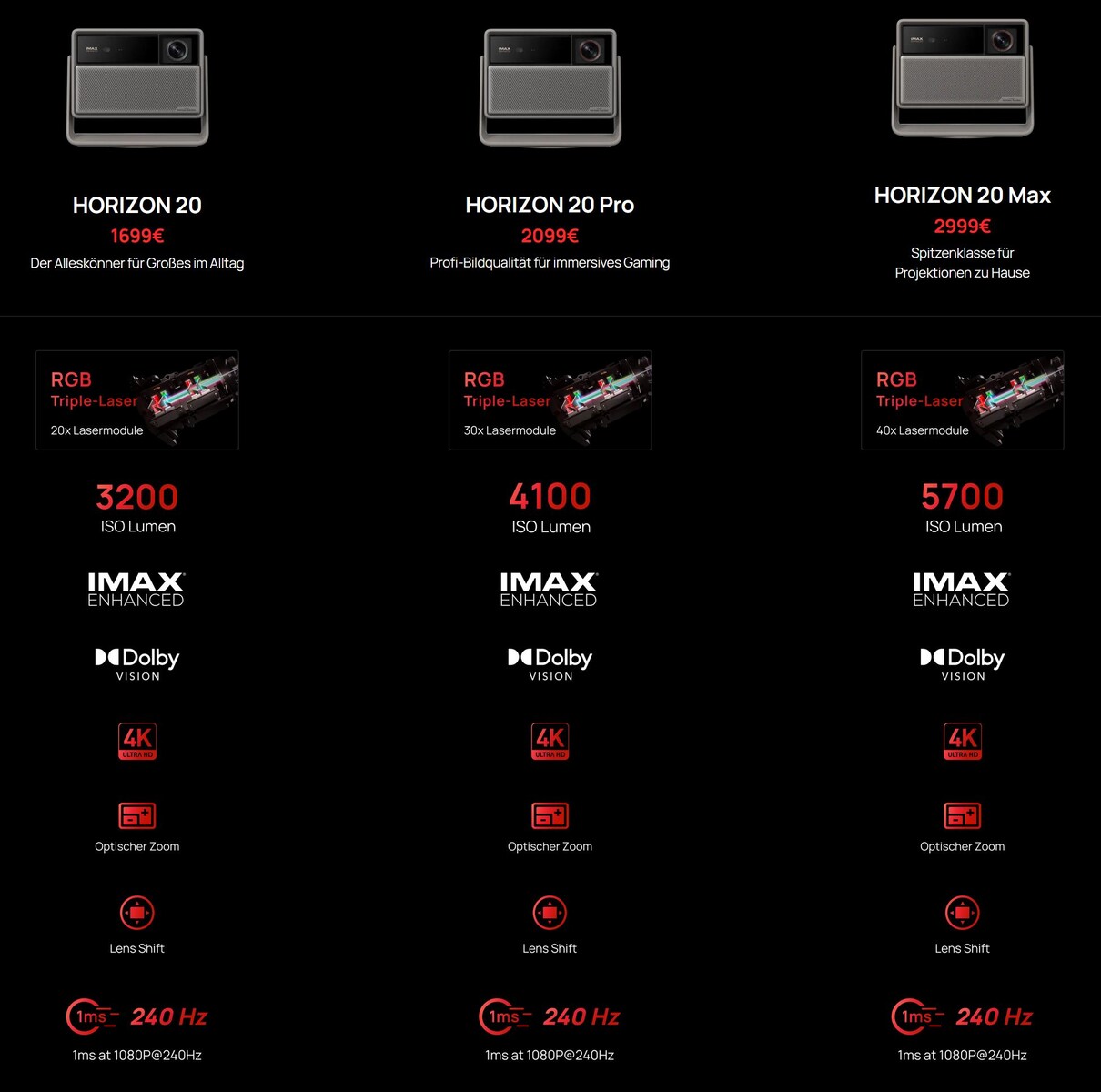 Der Horizon 20 ist das Einstiegsmodell der Serie und für eine unverbindliche Preisempfehlung von 1.699 Euro erhältlich. Dafür gibt es einen bis zu 3.200 ISO Lumen hellen Projektor mit X-Master RGB Triple-Laser-Engine. Der Horizon 20 Pro für 2.099 Euro UVP erreicht mit mehr Lasermodulen bis zu 4.100 ISO Lumen. Das Top-Modell der Serie, der Horizon 20 Max für 2.999 Euro UVP, setzt hier mit 5.700 ISO Lumen noch einen drauf.