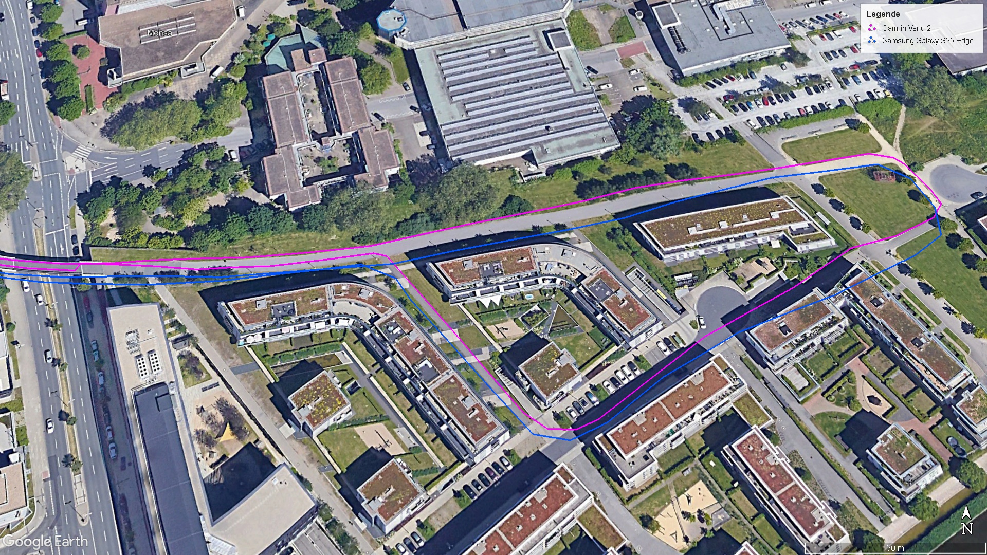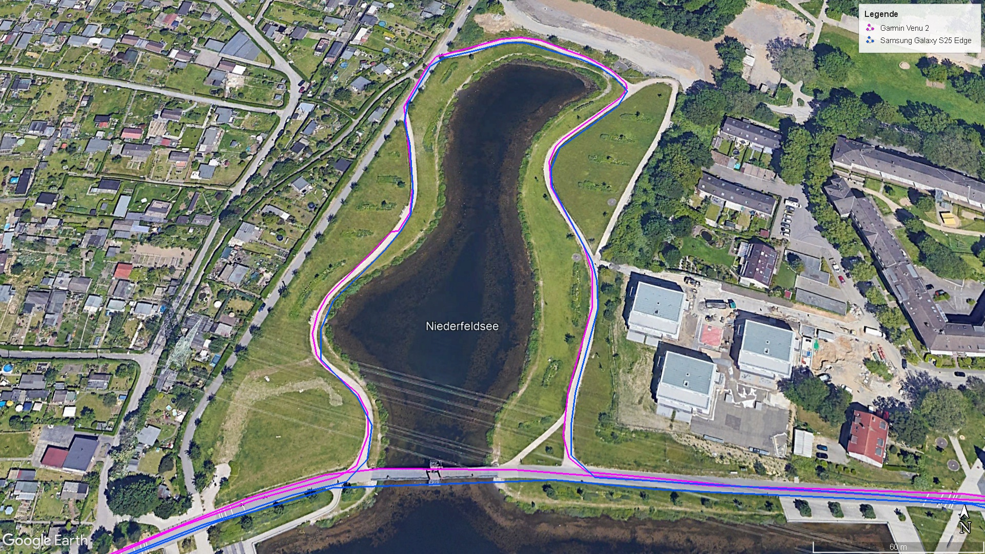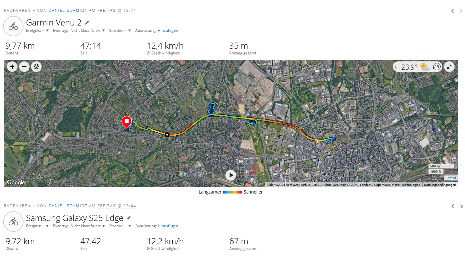 Wie der Praxistest zeigt, eignet es sich damit auch gut für Navigationsaufgaben. Die Wegstrecke einer rund 10 Kilometer langen Fahrradrunde zeichnet das Galaxy S25 zwar nicht ganz so akkurat auf wie die Fitness-Smartwatch Garmin Venu 2, doch die Abweichungen bleiben insgesamt auf einem überschaubaren Niveau.