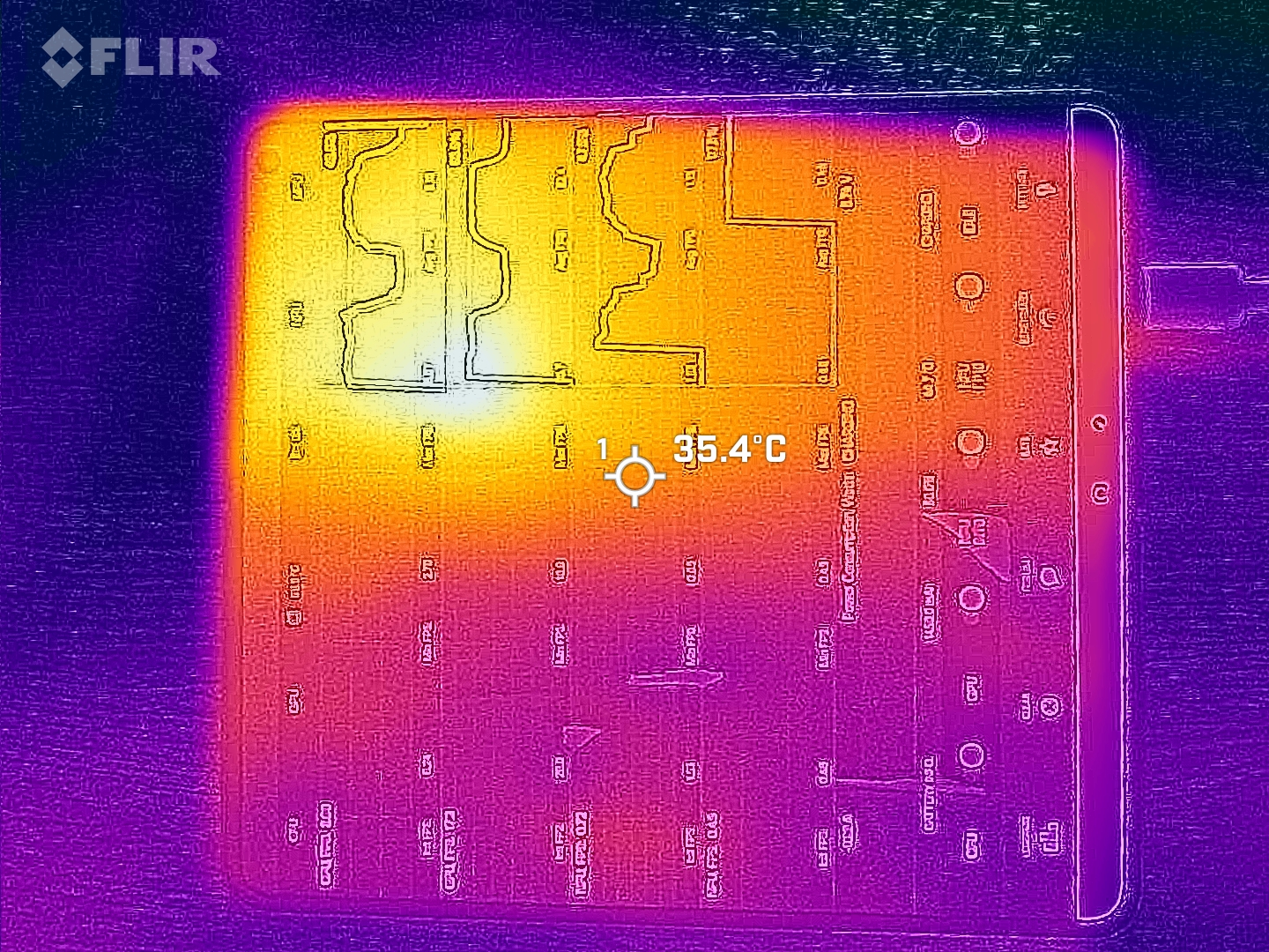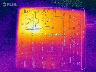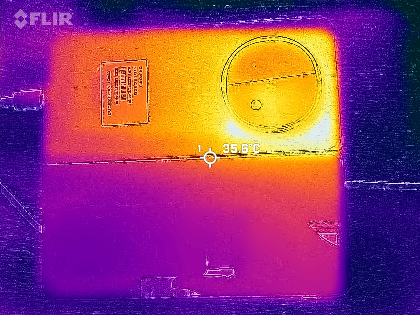 (-) Auf der Unterseite messen wir eine maximalen Wert von 45.4 °C (im Vergleich zum Durchschnitt von 34 °C).