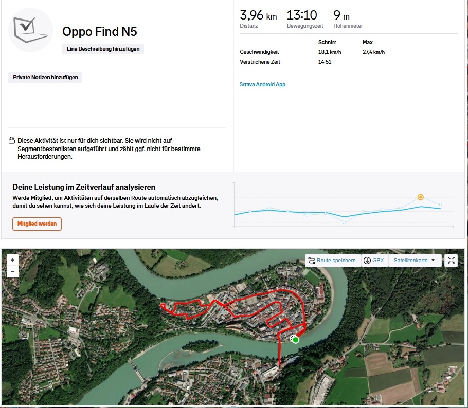 Auf einer Fahrradtour haben wir die Ortungsqualitäten des Find N5 im Vergleich zur Garmin Venu 2 angeschaut. Die Positionsbestimmung mit dem Oppo-Handy erfolgt mittels Dual-Band-GNSS und weist eine Genauigkeit von etwa 3 Metern auf. Die ermittelte Gesamtstrecke ist sehr ähnlich zur Garmin-Smartwatch und auch im detaillierten Streckenverlauf sind nur geringfügige Abweichungen erkennbar.