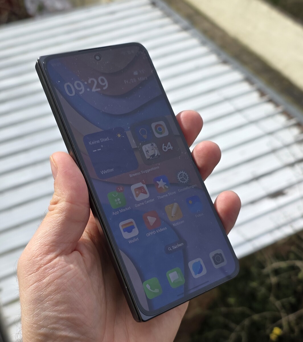 Das faltbare Dual-Shielded-Flexible-Display des Find N5 kommt auf 412 PPI bei einer Diagonale von 8,12 Zoll, womit das Oppo-Phone etwas mehr Bildschirmfläche als seine Konkurrenten bietet. Zudem wirkt das innere Panel nahezu faltenfrei, eine im Alltag spürbare Falz können wir nicht wahrnehmen. Der Hersteller bewirbt sein Falt-Handy auch mit einer „Minimised Crease“-Zertifizierung des TÜV Rheinland.