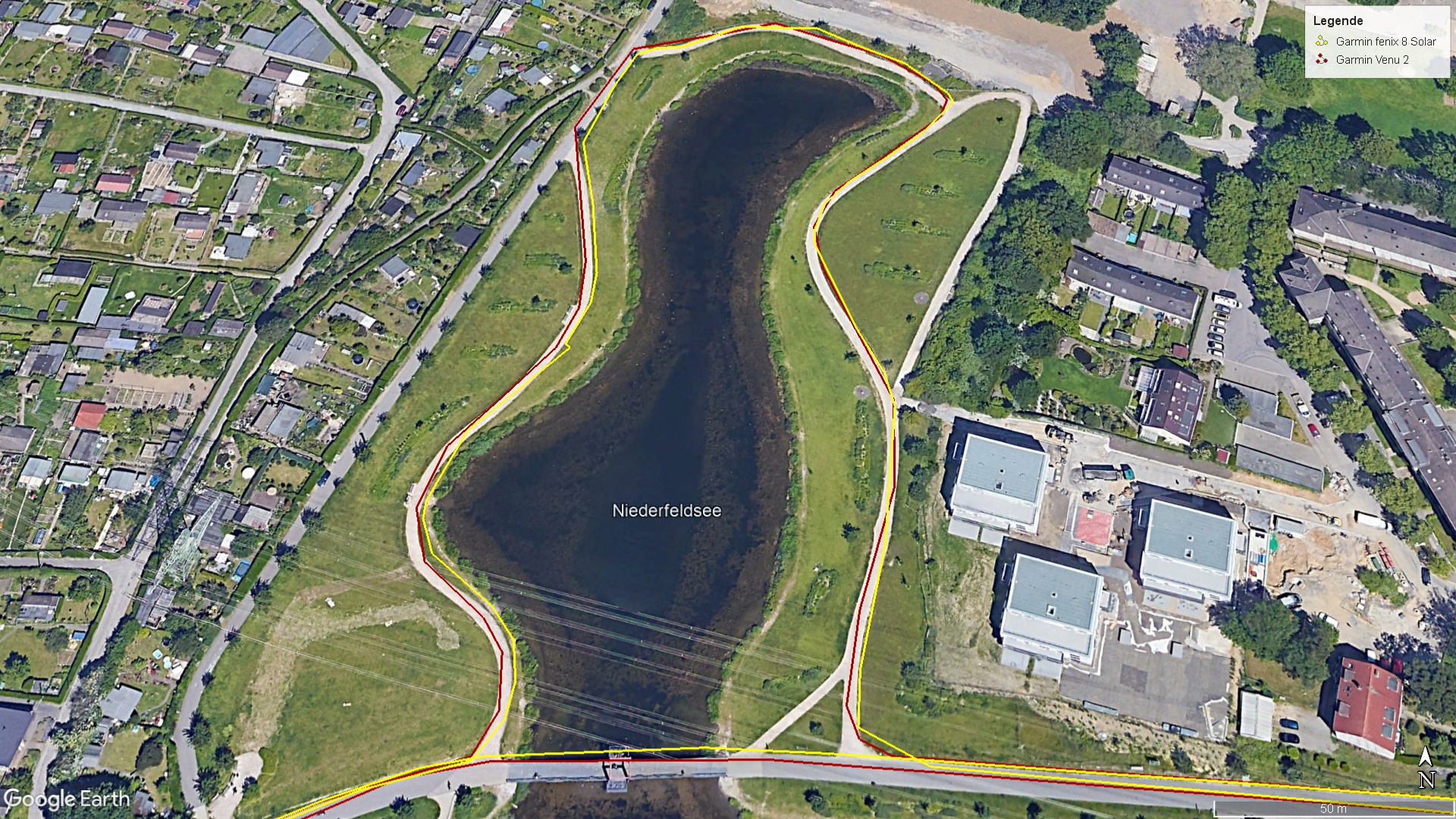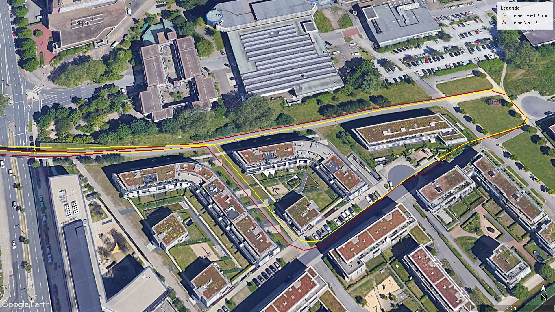 Um die Genauigkeit der Garmin-Smartwatch bei der Ortung in der Praxis zu überprüfen, nehmen wir die Fenix 8 Solar mit auf eine Radtour. Die ermittelte Wegstrecke vergleichen wir mit unserem Referenzgerät, der Garmin Venu 2. Das Ergebnis der Ortung ist sehr überzeugend, allerdings zeigt die Darstellung der zurückgelegten Route geringfügige Unterschiede zur tatsächlichen Wegstrecke.