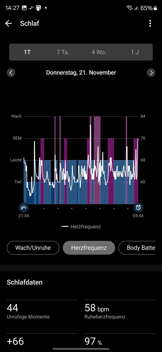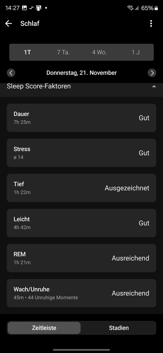 Nach dem Aufwachen erhalten Nutzer einen Morgenbericht mit dem Überblick über den Schlaf der letzten Nacht, ihre Trainingsaussichten und den Status der Herzfrequenzvariabilität (HRV). Die Werte werden auch in der App in einem Diagramm zur Verfügung gestellt. Ein Export der nächtlichen Daten ist leider nicht möglich.