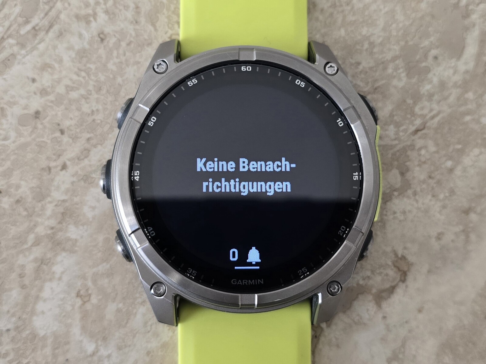 Mehr überzeugen kann die Fenix 8 bei der Benachrichtigungsfunktion. Nachrichten oder E-Mails kommen nahezu in Echtzeit mit einer Verzögerung von nur wenigen Sekunden und werden zuverlässig angezeigt. Die proprietäre Garmin-Software beherrscht großenteils die von uns getesteten Emojis und zeigt auch Bilder an, allerdings nicht wirklich scharf. Antworten sind mit vordefinierten Kurzantworten möglich, eine Tastatur- oder Spracheingabe gibt es nicht. Sprachnachrichten über WhatsApp werden leider auch nicht unterstützt. Hier haben Uhren mit Google Wear OS einen großen Vorteil.