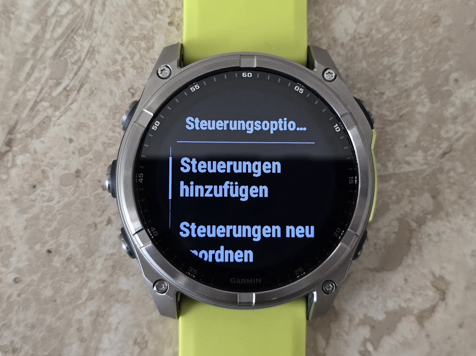 Bedient wird die Fenix 8 über das kapazitative Display und insgesamt fünf Funktionstasten. Eine Krone gibt es nicht und auch die Lünette ist nicht drehbar. Mit einem Wisch nach unten kommen Nutzer zu den Benachrichtigungen. Ein Wischen nach oben öffnet die Übersichten-Liste, dessen Reihenfolge und Inhalte individualisiert werden können. Seitliches Wischen von links oder rechts wird nicht unterstützt. Dafür sind die verbauten Tasten mit vielen Funktionen belegt.