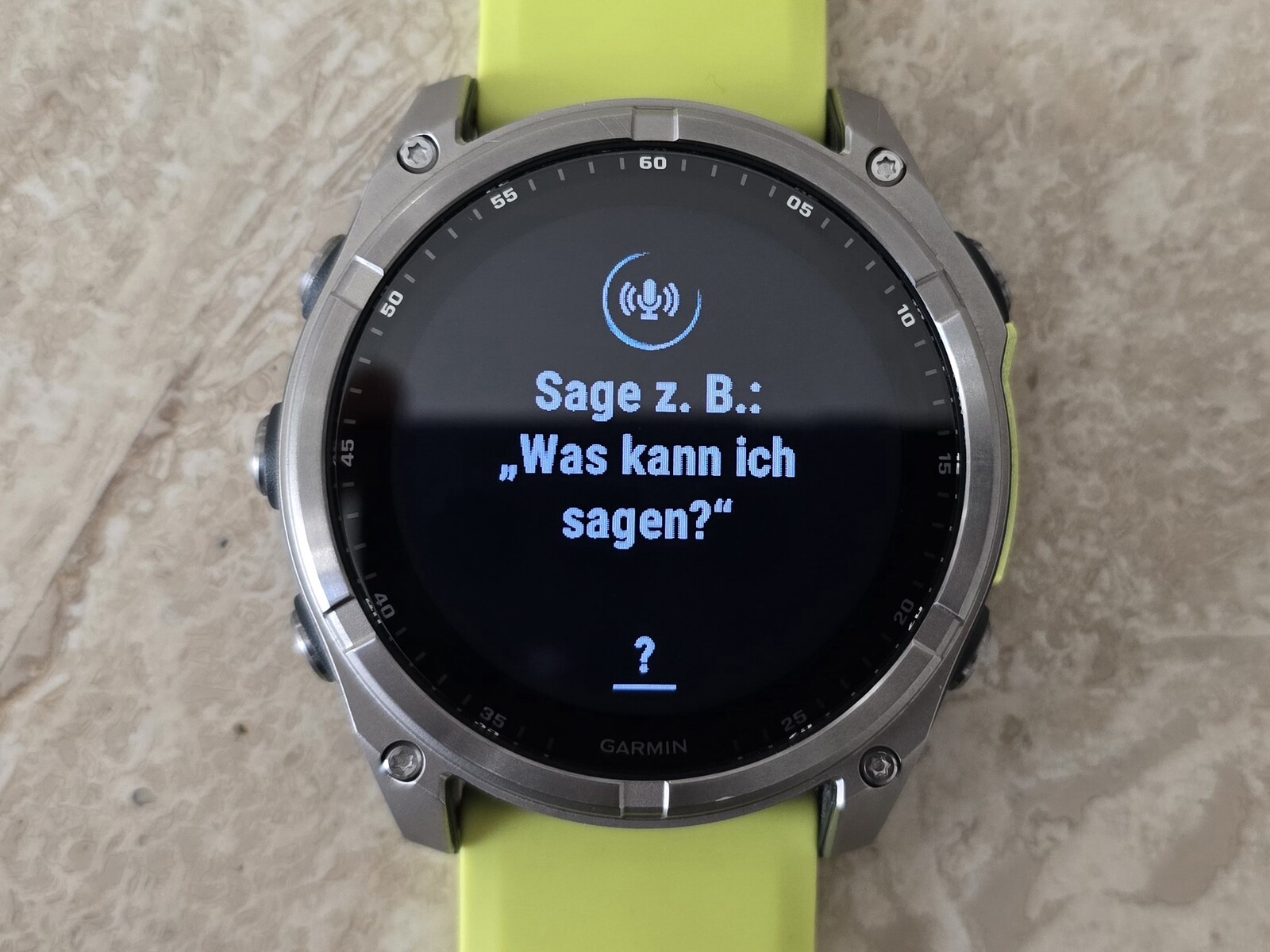 Auf der Fenix 8 ist ein hauseigener Sprachassistent verfügbar. So können ohne Telefonverbindung einfache Spracheingaben umgesetzt werden, wie beispielsweise das Starten von Trainingseinheiten oder die Regelung der Helligkeit der Displayhintergrundbeleuchtung. Im Test funktioniert die Spracheingabe zufriedenstellend, allerdings wird der Wille des Nutzers nicht immer akkurat umgesetzt. Das Starten des Assistenten ist ausschließlich per Tastendruck möglich.