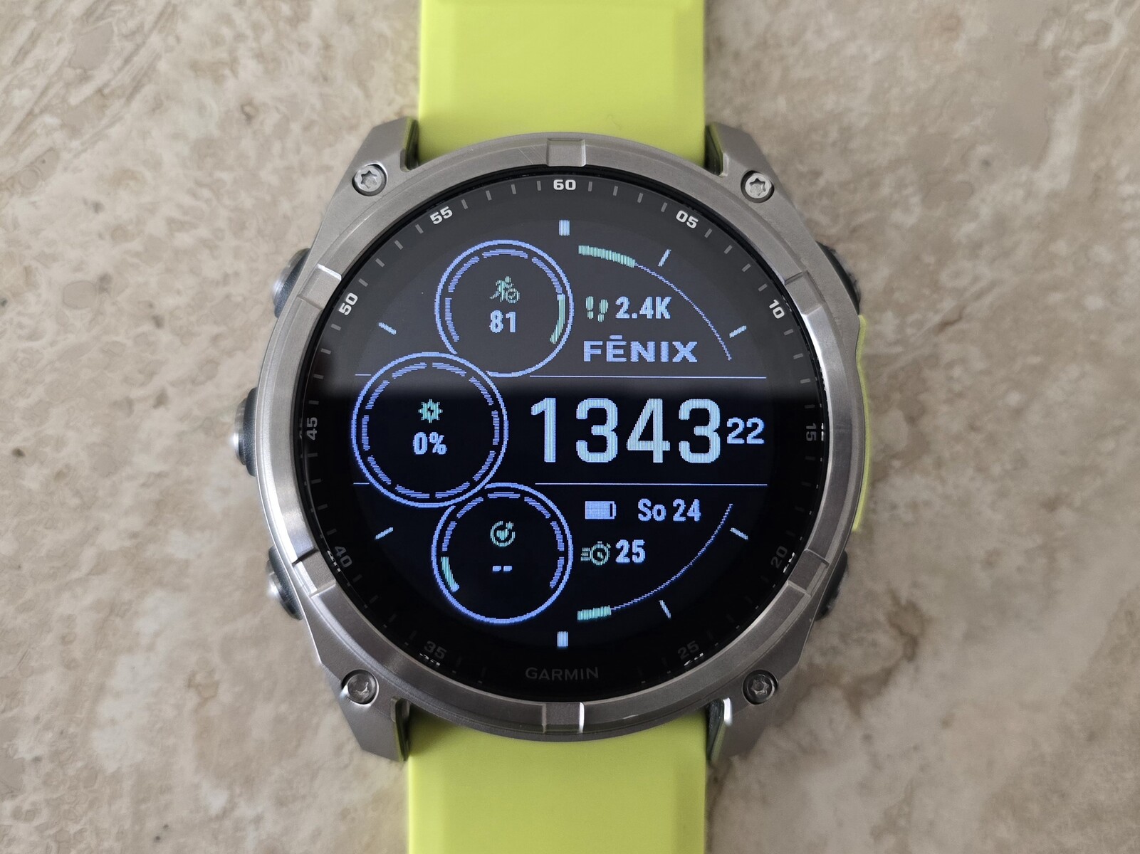 Bei den Versionen mit AMOLED-Panel kann auch das widerstandsfähige Saphirglas gegen Corning Gorilla Glas ausgetauscht werden (UVP ab 1.000 Euro). Während die Fenix 8 mit OLED-Display kräftigere Farben und einen flüssigeren Bildwechsel darstellen, verbraucht das MiP-Display weniger Strom. Wir haben als Testgerät die Version mit einem MiP-Bildschirm in der größten Ausführung von Garmin zur Verfügung gestellt bekommen.