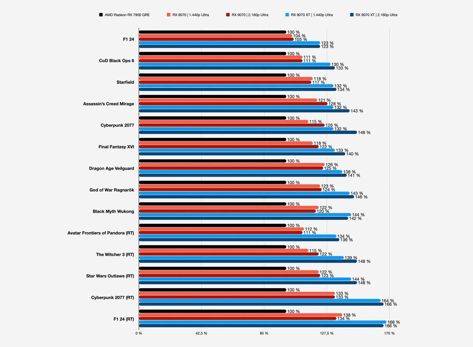 Die AMD Radeon RX 9070-Serie kommt voraussichtlich im März auf den Markt. Nachdem Leaks bereits die wichtigsten Spezifikationen und die US-Preise enthüllt haben, konnte VideoCardz an eine Reihe von Gaming-Benchmarks gelangen, die angeblich direkt von AMD stammen sollen. Demnach soll AMD bewerben, dass die Radeon RX 9070 XT die Gaming-Performance der Radeon RX 7900 GRE (ca. 649 Euro auf Amazon) durchschnittlich um 42 Prozent übertrifft, wobei diese Angabe auf 30 getesteten Spielen bei 4K-Auflösung und Ultra-Einstellungen basiert.