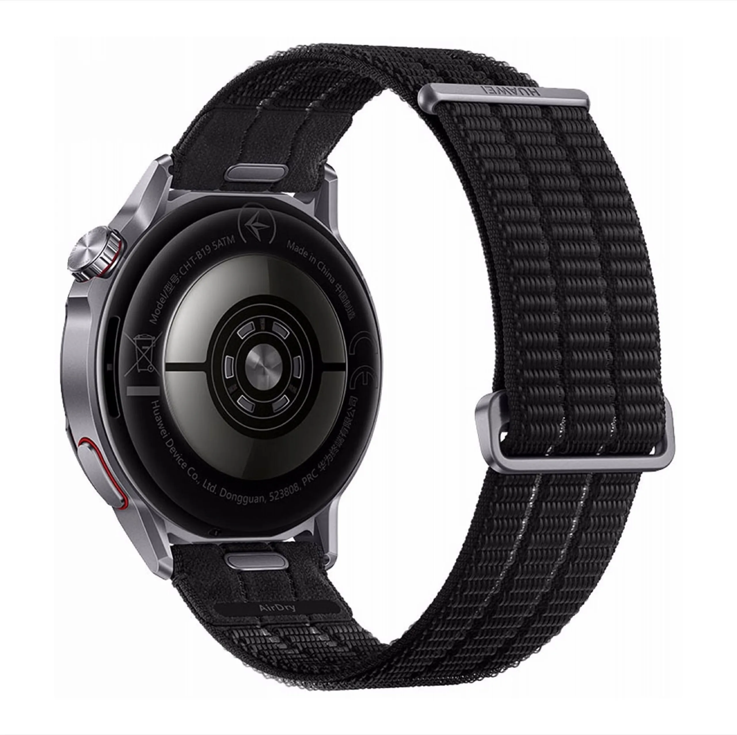 Das Design gibt sich ohne die leicht eckige Gehäuse-Einfassung moderner, die Lünette wird in zwei Varianten um Farbakzente in Blau oder Orange erweitert, wobei Huawei wie gehabt zwei Buttons an der rechten Seite verbaut. Dei Uhr dürfte mit Standard-Armbändern kompatibel sein. Das mitgelieferte AirDry-Armband ist aber neu, und soll durch die etwas breiteren Fäden, die zwischen dem Nylon-Geflecht verlaufen, nur minimalen Hautkontakt haben. So soll die Luftzirkulation verbessert und somit Schweiß reduziert werden.