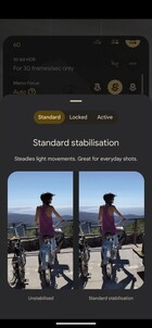 Und weiter geht es mit den Änderungen. Wer durch die verfügbaren Modi scrollt, wird demnach einige neue Modi erkennen, die allerdings bereits vorher da waren, nun aber ausgegliedert wurden. Das betrifft etwa den "Long Exposure" und "Action Pan" Modus, die bisher gemeinsam unter dem Begriff "Motion" zu finden waren. Auch der Cinematic Pan Stabilisierungs-Modus wird nun in Form des "Pan-Modus" als separater Modus weitergeführt. Apropos Stabilisierung: Das frühere Menü für die Auswahl der Stabilisierungsmethode wurde nun in die allgemeinen Kameraeinstellungen übersiedelt, wo künftig die Methoden "Standard", "Locked" sowie "Active" auswählbar sind.