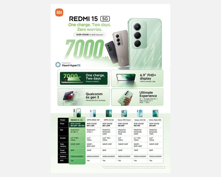 Das Gehäuse des Redmi 15 5G ist nach IP64 zertifiziert und somit nur gegen Wasserspritzer geschützt, aber nicht vollständig wasserfest. Das Promo-Bild bestätigt darüber hinaus, dass das Smartphone einen NFC-Chip, Support für Google Gemini, 8 GB Arbeitsspeicher und 256 GB Flash-Speicher besitzt. Das Redmi 15 5G soll zu Preisen ab 699 RM (ca. 141 Euro) auf den Markt kommen.