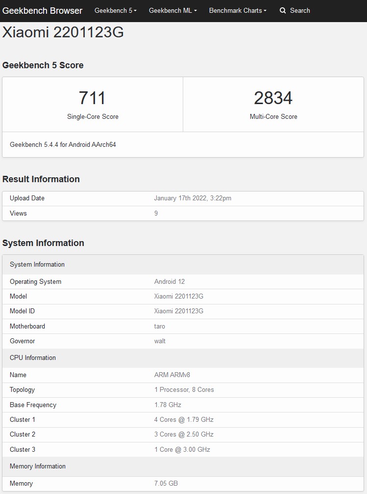 Der ganz unten angehängte Geekbench-Eintrag verrät ansonsten nur noch, dass die Xiaomi 12 Global Version analog zu China ebenfalls mit Android 12 als Mobile-OS und mit dem Qualcomm Snapdragon 8 Gen 1 Chipsatz arbeitet. Auch hier scheint Xiaomi für das international erhältliche 12er Handy zur China-Ausführung keine Änderungen zu machen. Vor Kurzem wurden das Xiaomi 12 mit der Modellnummer 2201123G und das 12 Pro mit 2201122G in Indien zertifiziert, was ebenfalls für einen kurz bevorstehenden, internationalen Launch der Xiaomi-12-Handys spricht.