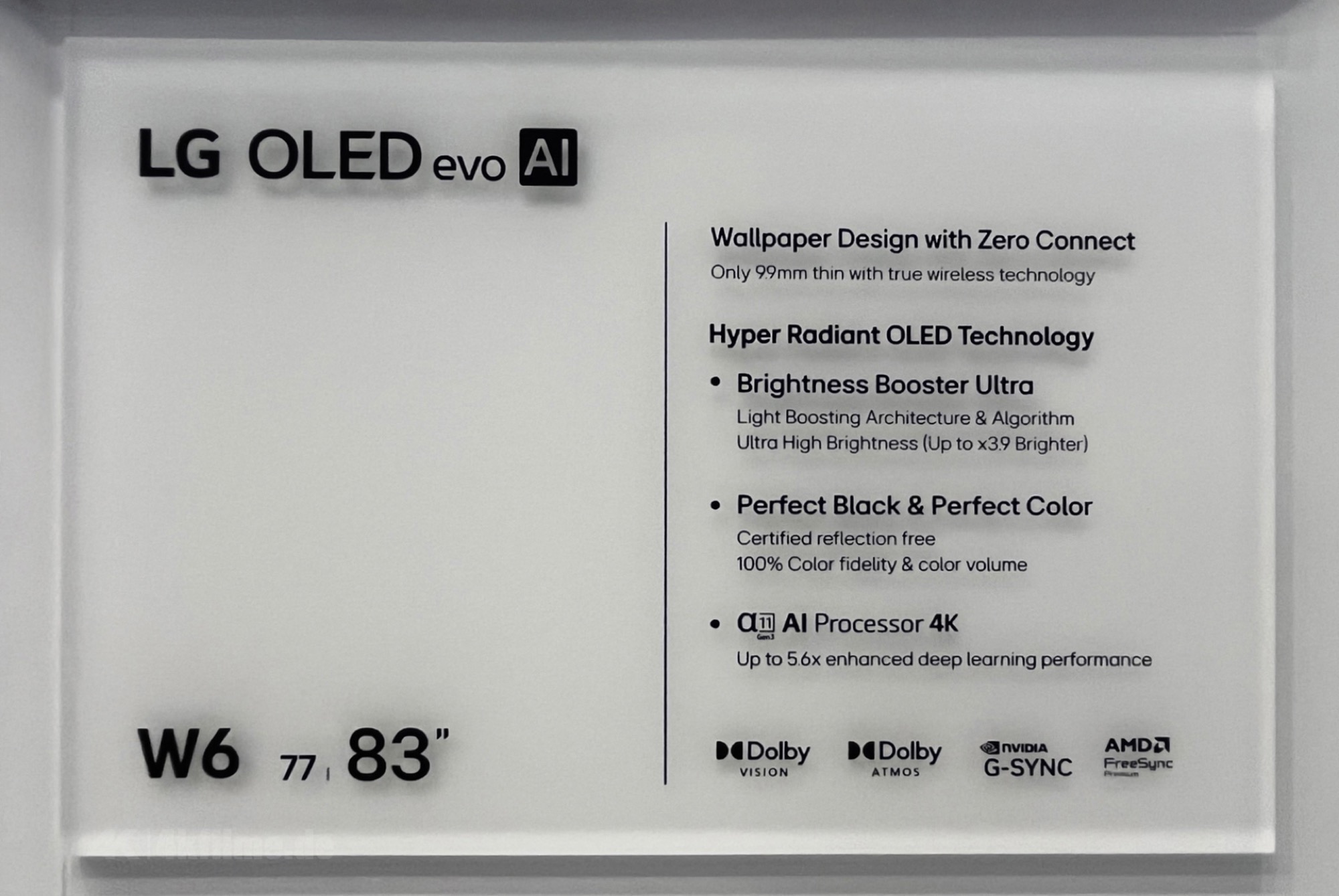 Der LG OLED W6 dürfte fast baugleich mit dem G6 sein, allerdings mit einem großen Unterschied: Die HDMI- und USB-Anschlüsse finden sich an der Zero Connect Box statt direkt am Fernseher. Diese Box wird drahtlos mit dem Smart TV verbunden, und ermöglicht es, die Kabel zu Endgeräten wie einer PlayStation 5 zu verstecken, und lediglich ein Stromkabel zum 9,9 Millimeter dünnen Smart TV führen zu müssen. Der LG OLED W6 wird offenbar nur mit einer Diagonale von 77 Zoll oder 83 Zoll angeboten.